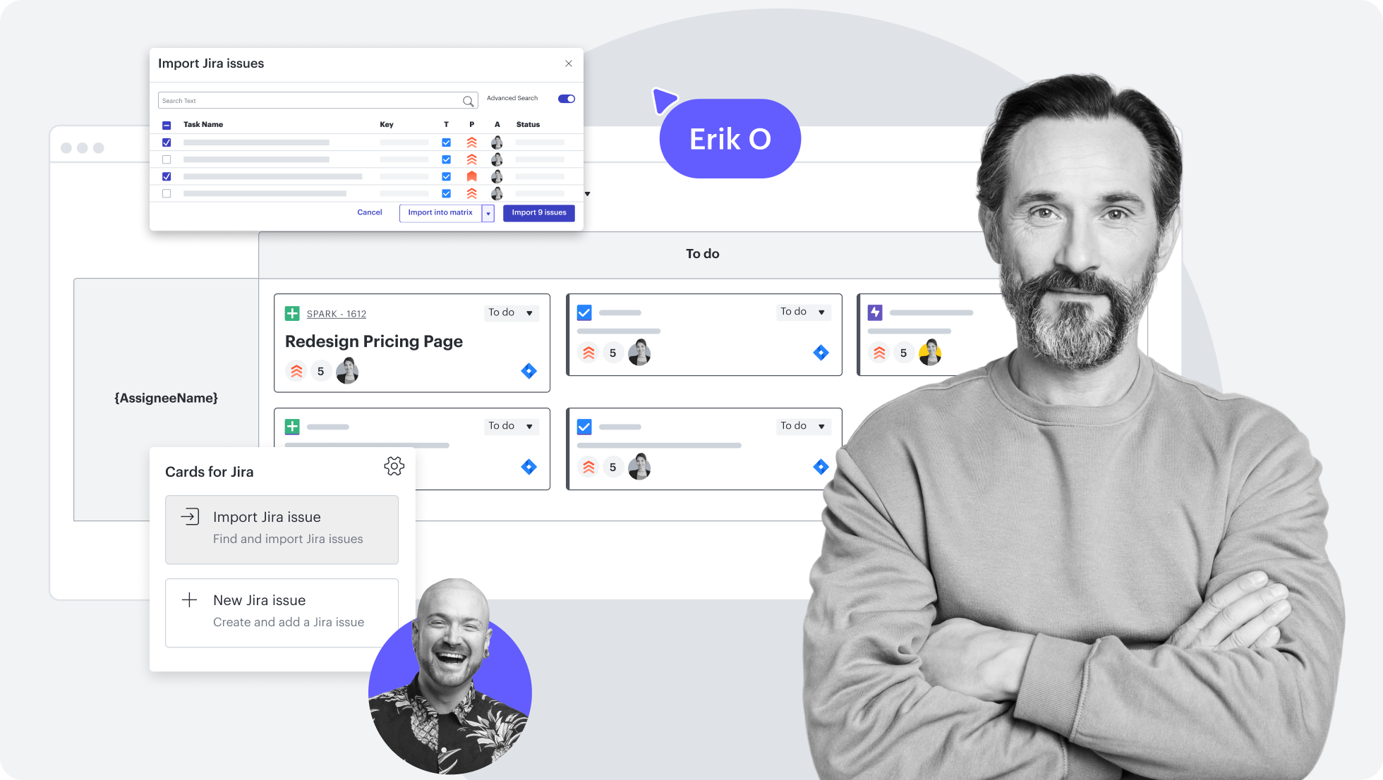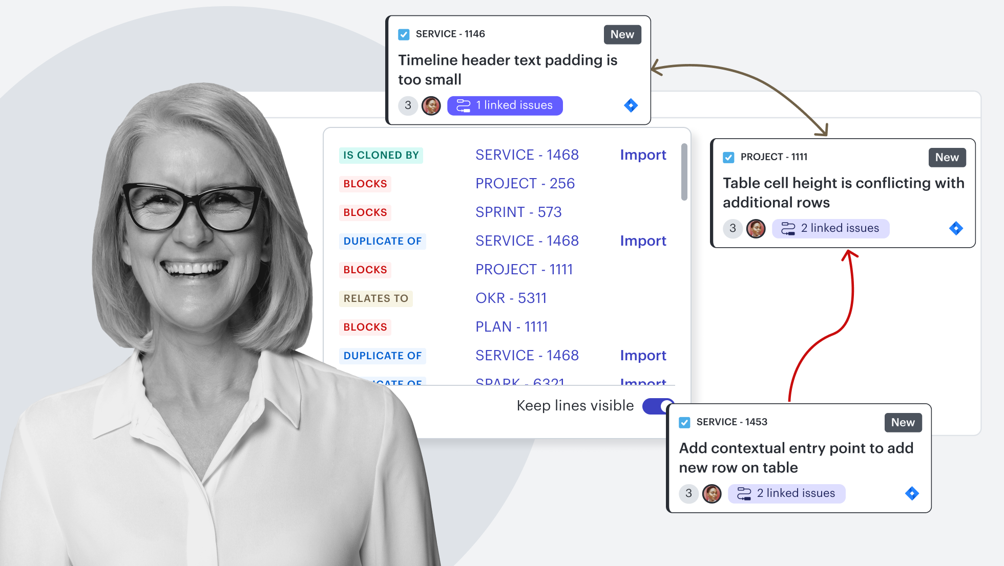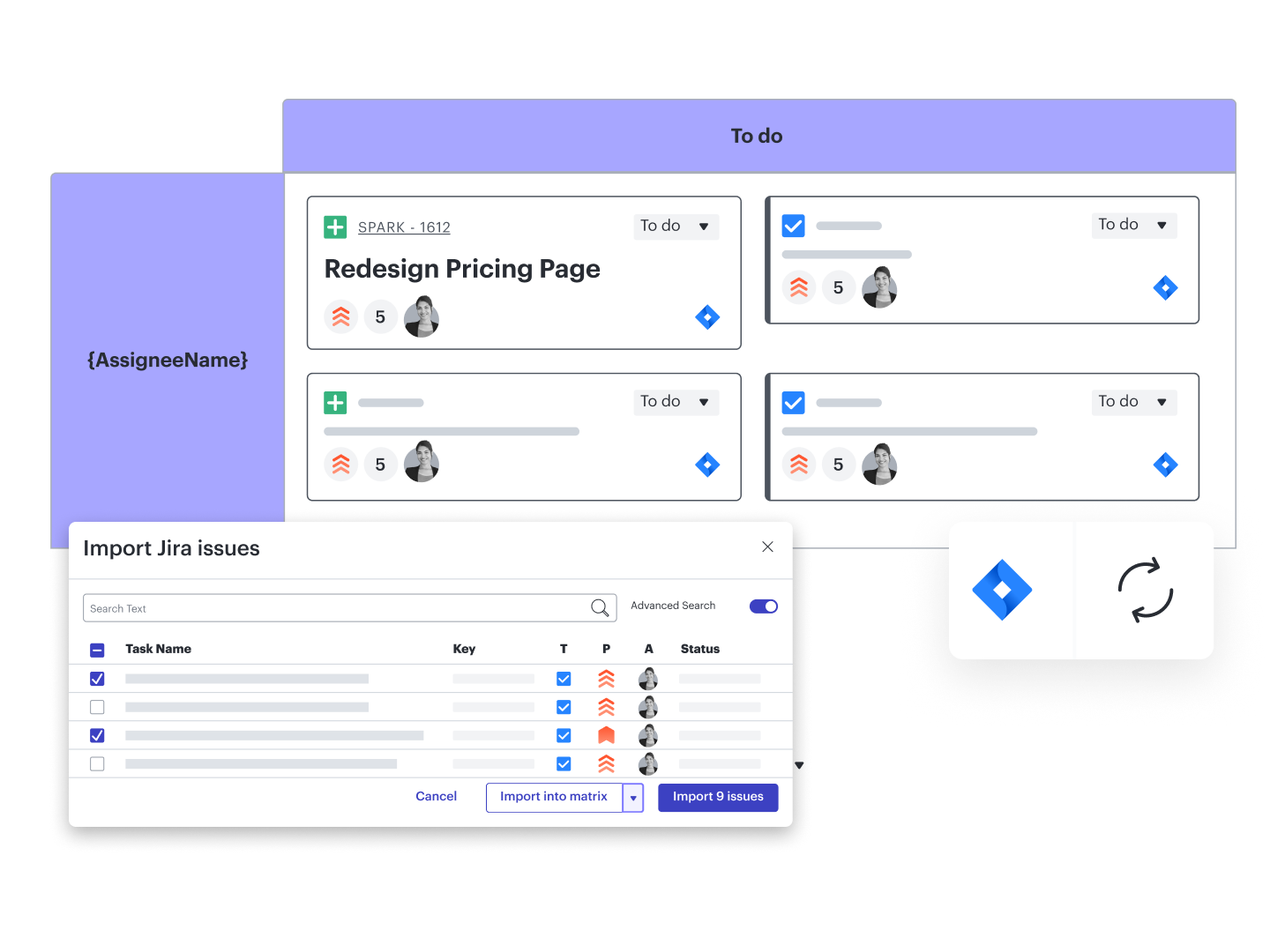 Increase visibility and map dependencies using our bi-directional integrations with Jira or Azure DevOps. Organize data-backed cards in a Dynamic Table and add a progress bar.