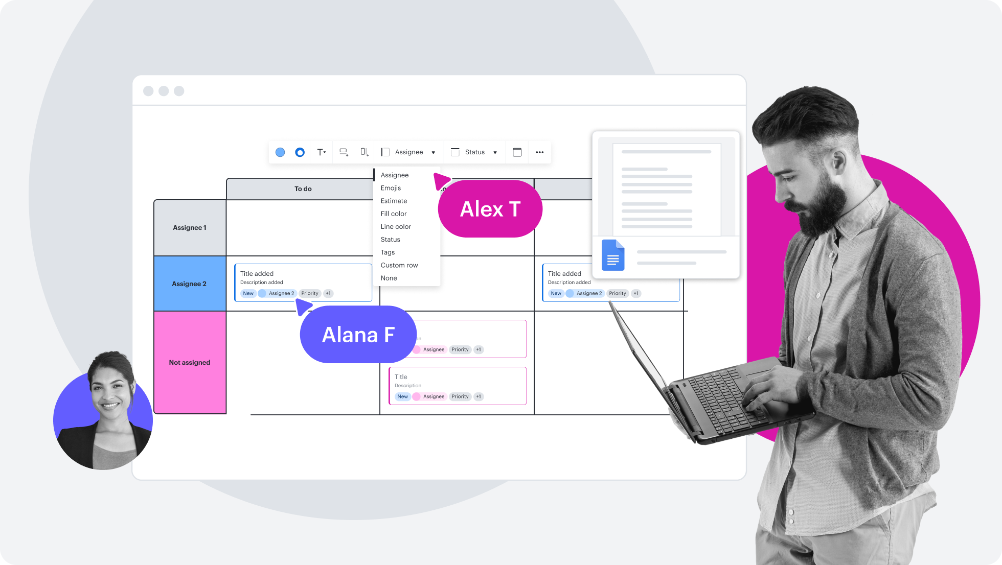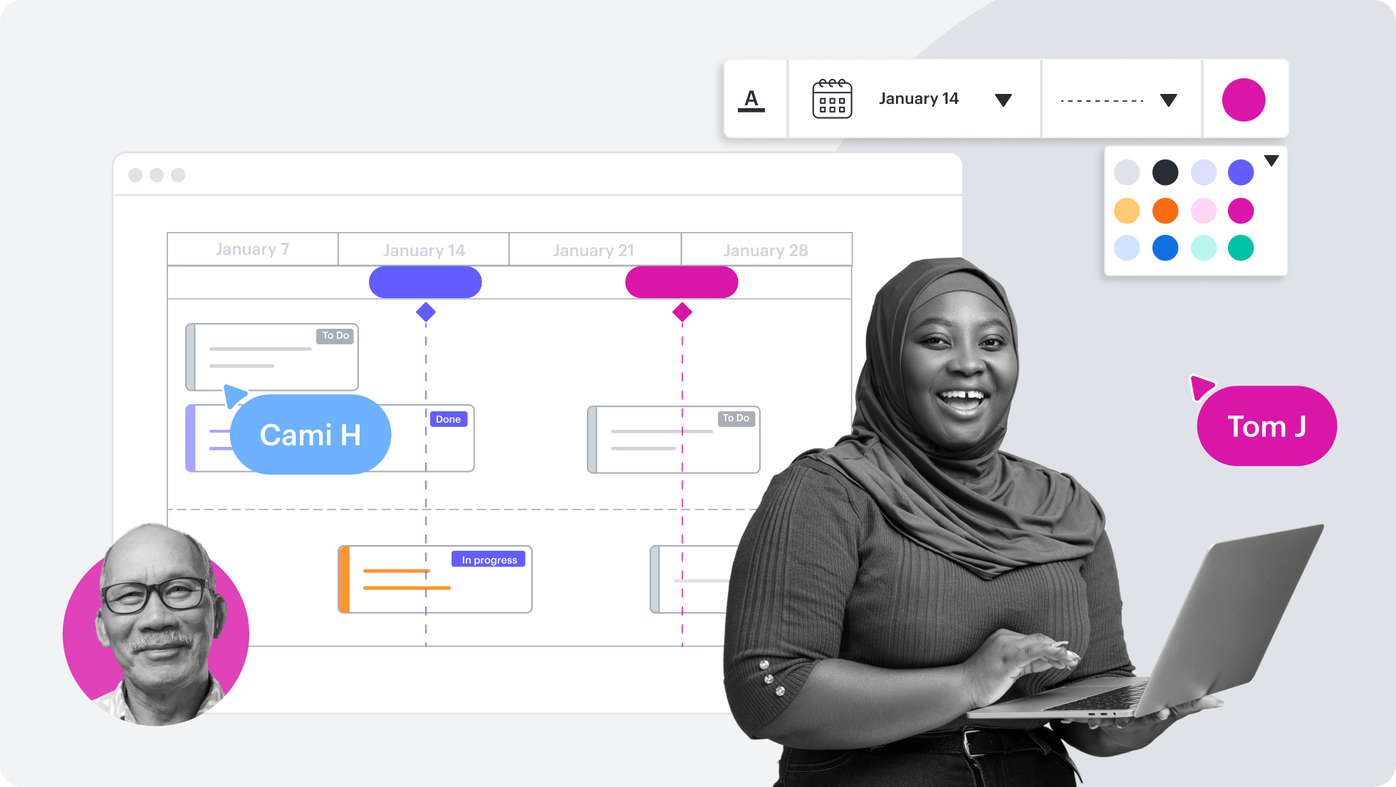 Create timelines to show past events or future plans. Add details such as status, assignee, or estimate.