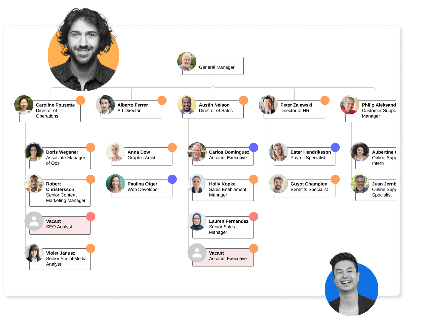Create dynamic org charts to easily see and understand reporting structures, team roles, and workloads. Use group view to optimize team structures and staff projects efficiently.