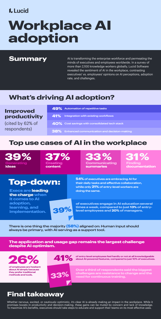 To shed light on the many unknowns surrounding AI in the workforce, Lucid conducted a survey of more than 2,500 knowledge workers globally. We’ve uncovered the top benefits, use cases, and gaps surrounding AI in the workplace. The biggest gap of all? The perception gap between how executives and employees view and apply AI.