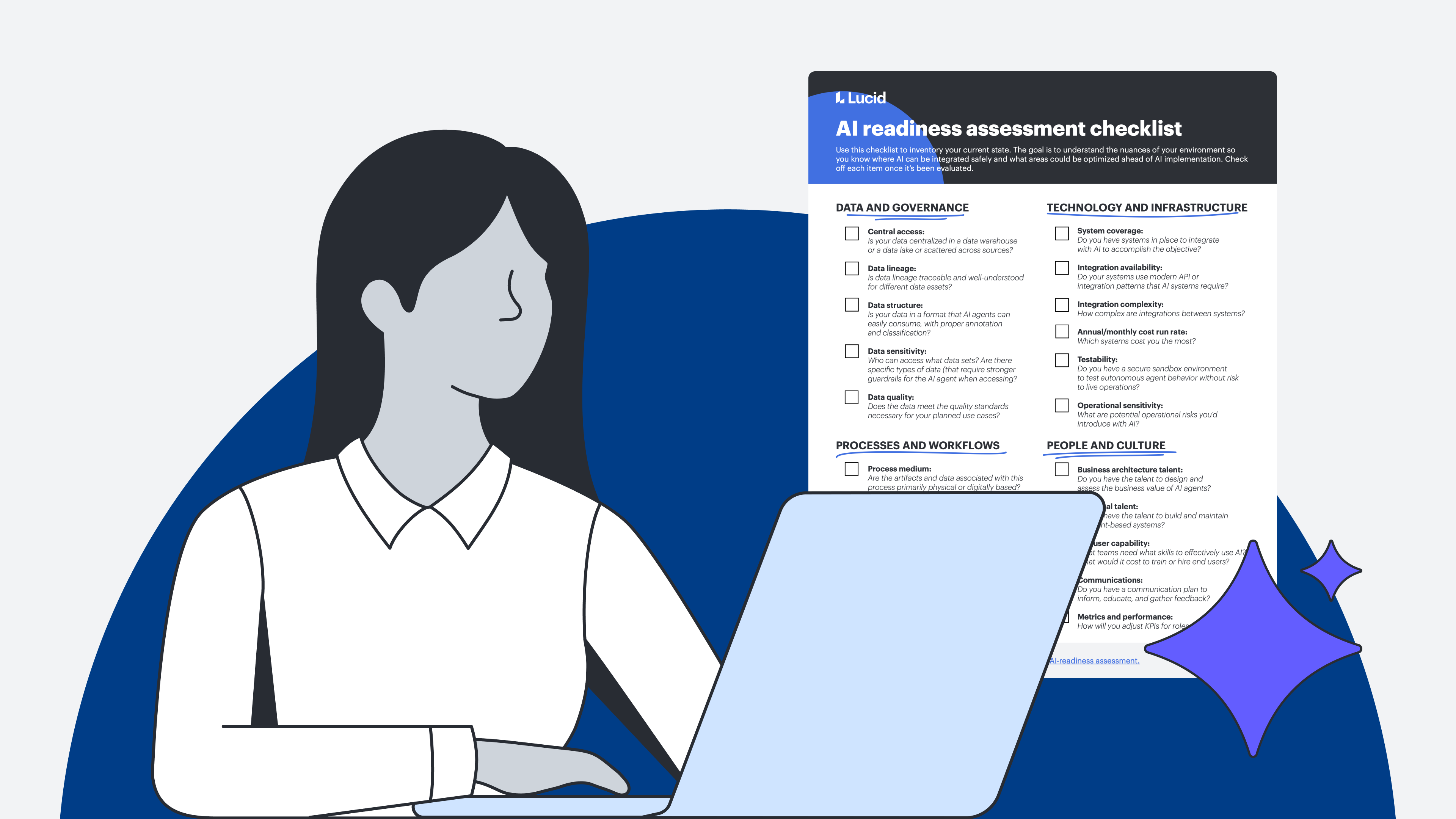 Evaluate your processes, technology, data, and people for AI readiness with the following checklist. Iâve included lists of questions and considerations for each category to guide your evaluation as you complete the checklist. I recommend having your current-state documentation on hand to answer the questions as accurately and thoroughly as possible.Â