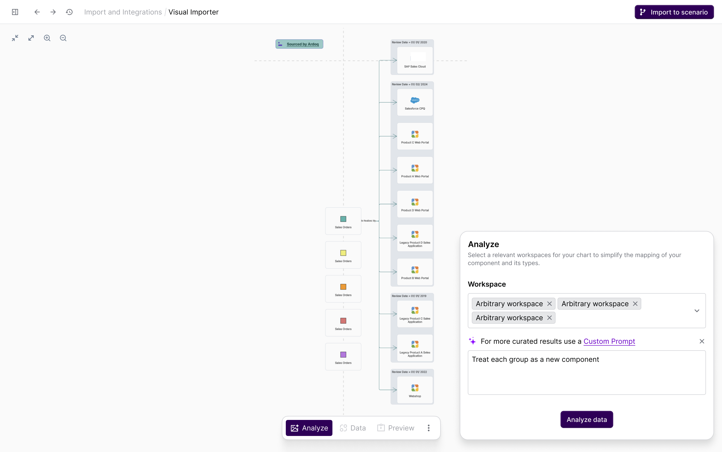 Once the future state is defined, teams can export it back to Ardoq. Using Lucidchart’s API and Ardoq’s AI-assisted analysis, visual data is automatically reconstructed into Ardoq’s structured model. Known components are matched, new ones flagged, and all relationships preserved. This model allows enterprise architects to compare current and future states, visualize changes, and monitor progress in real time.