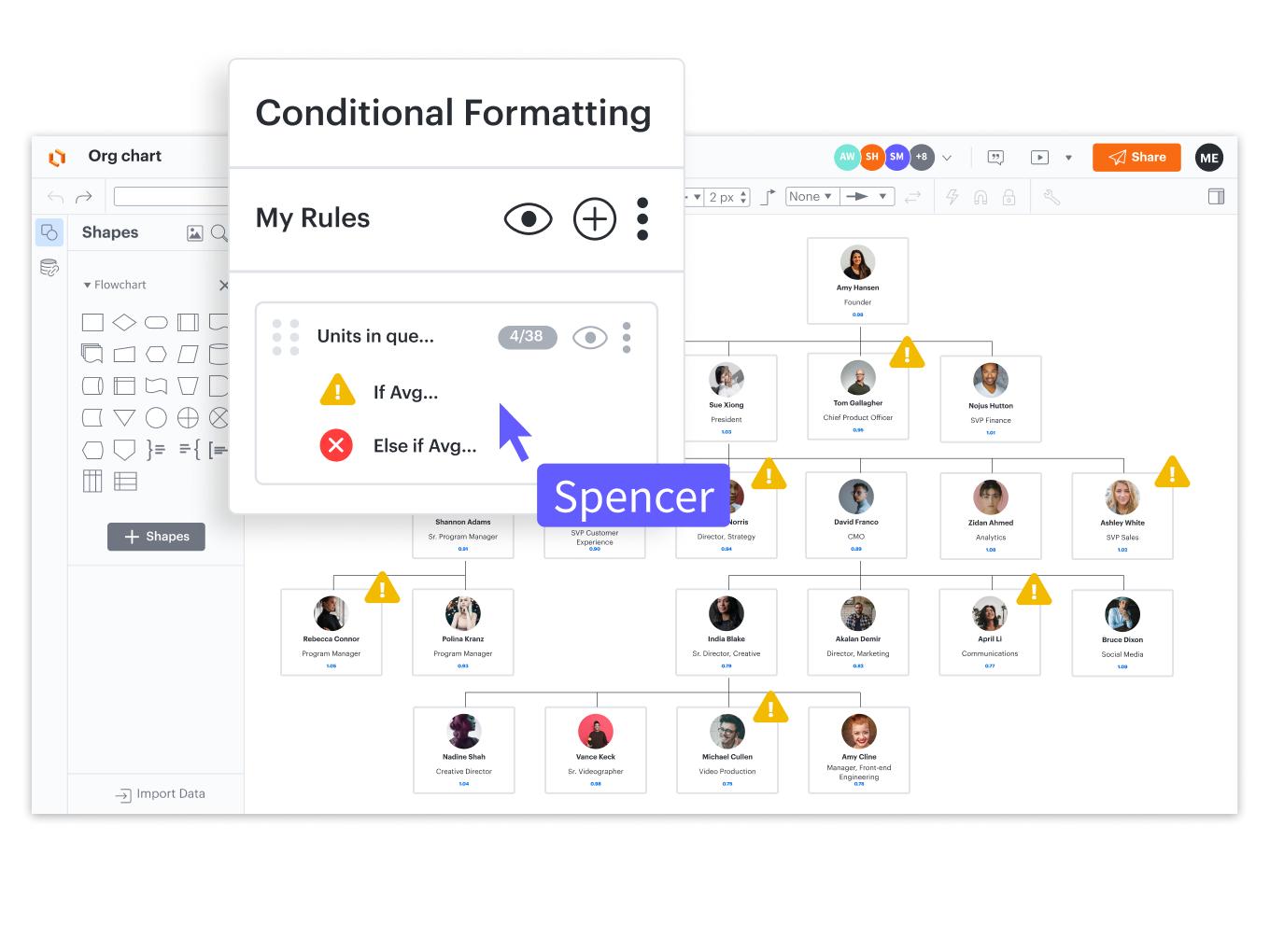By applying automated conditional formatting to your diagrams in this way, you’ll have the information at your fingertips to alert stakeholders to priority items and make key decisions around hiring, budgeting, or strategy.