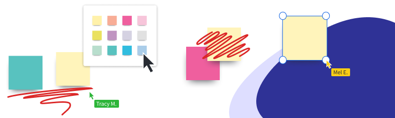 Add authors—Keep track of ideas and feedback in large groups by toggling on the "Show authors" feature. With this feature, every sticky note will have its author's name displayed in the bottom right-hand corner. Even if the sticky note has been edited by another contributor, the original author's name will be displayed as well as the person who made changes.
