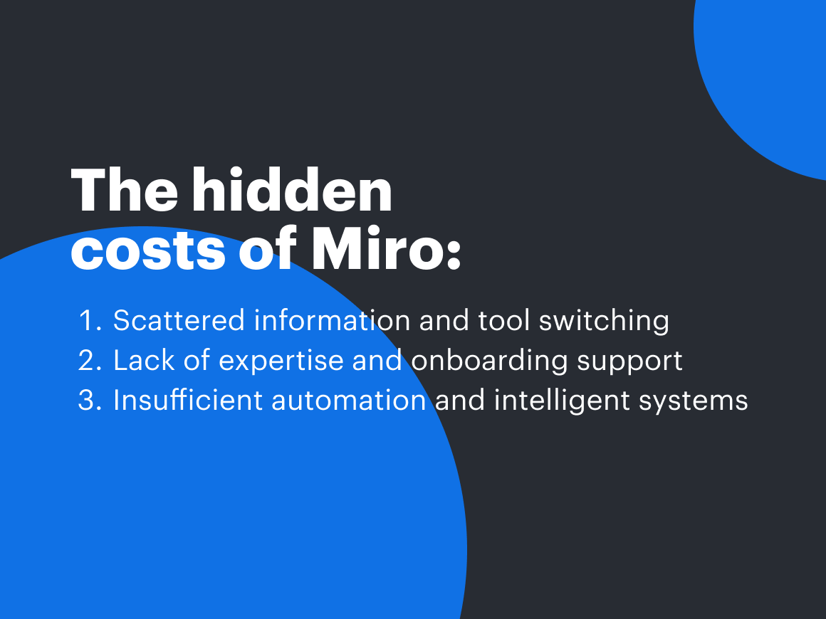 Miro’s limitations can lead organizations to need multiple software just to support the entire project workflow. If teams are constantly switching between multiple applications to get their work done, information becomes scattered across tools.