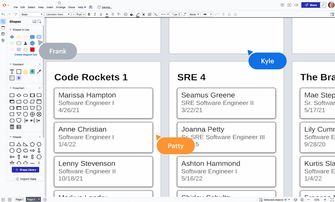 Unlike traditional org charts that are static representations of an organization’s structure and departmental relationships, org charts in Lucid are dynamic and allow us to visualize changes as roles evolve, new hires join, and others depart.