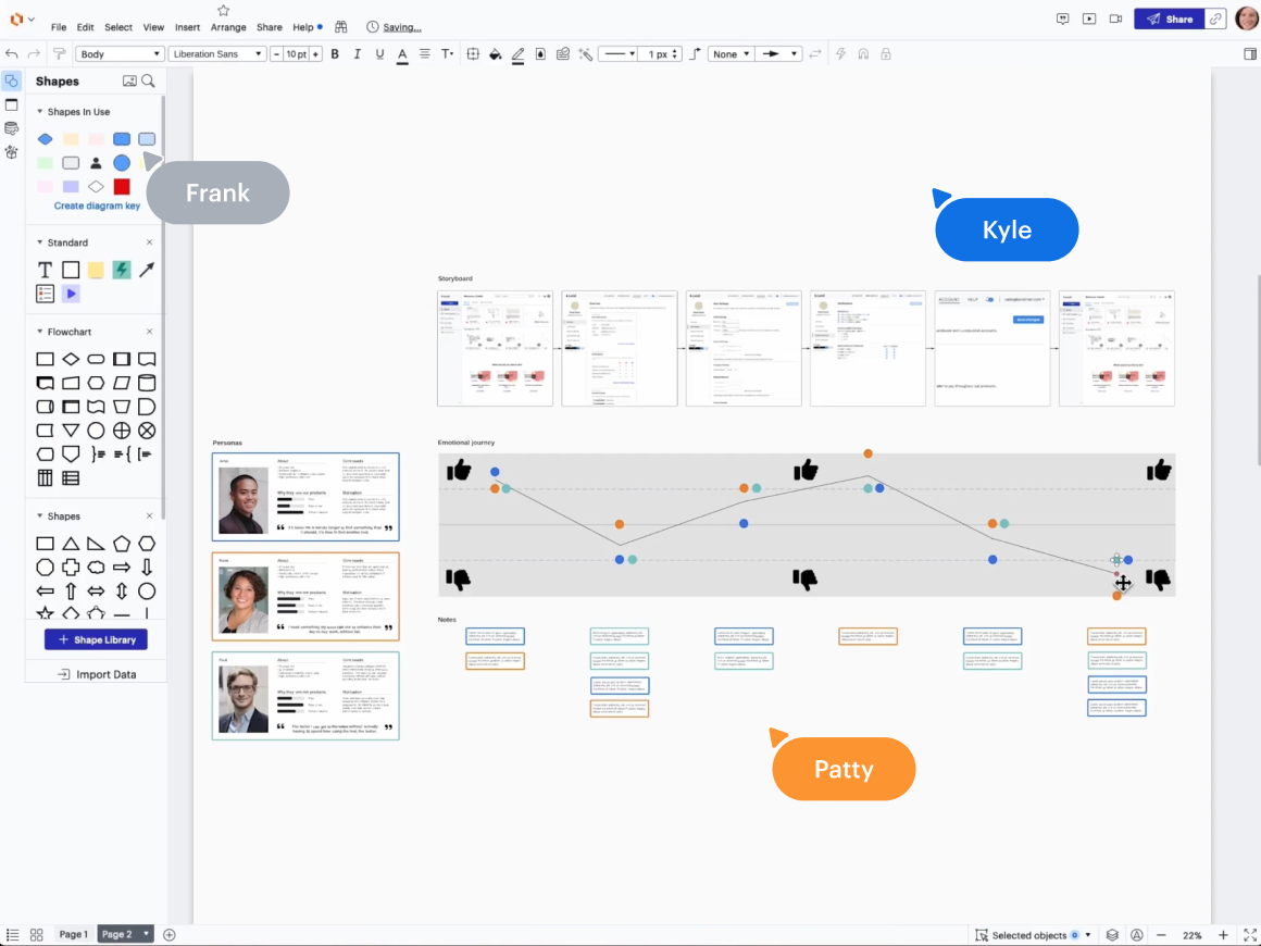 • Then we engage directly with users through interactive platforms right in Lucid. “We might have users follow a path where they answer questions, sometimes giving feedback directly on prototypes,” Dilworth explains. “Or we might have users explain—in a visual way—how they do a certain activity. We’ve even had users build out their ideal scenarios.”