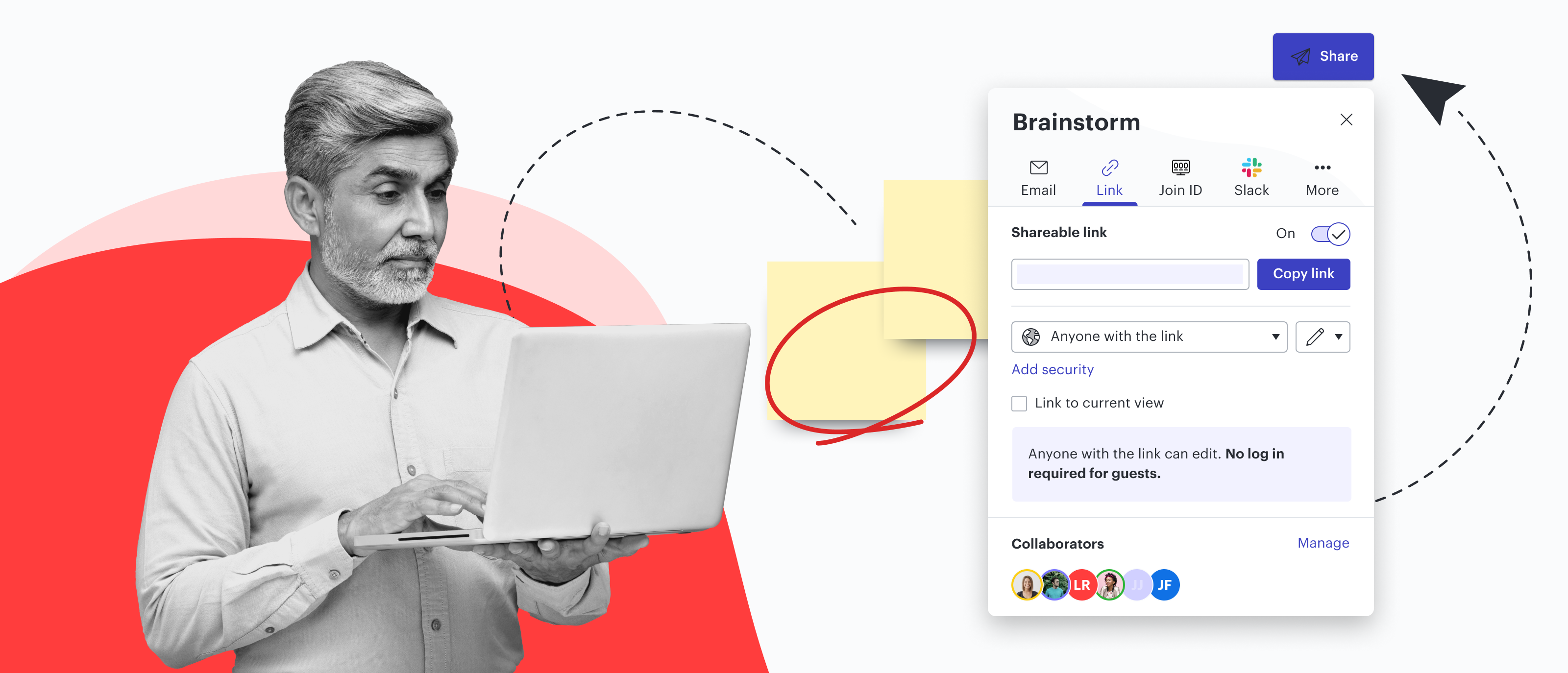 Click the share button to share via email, link, Slack, or Join ID.