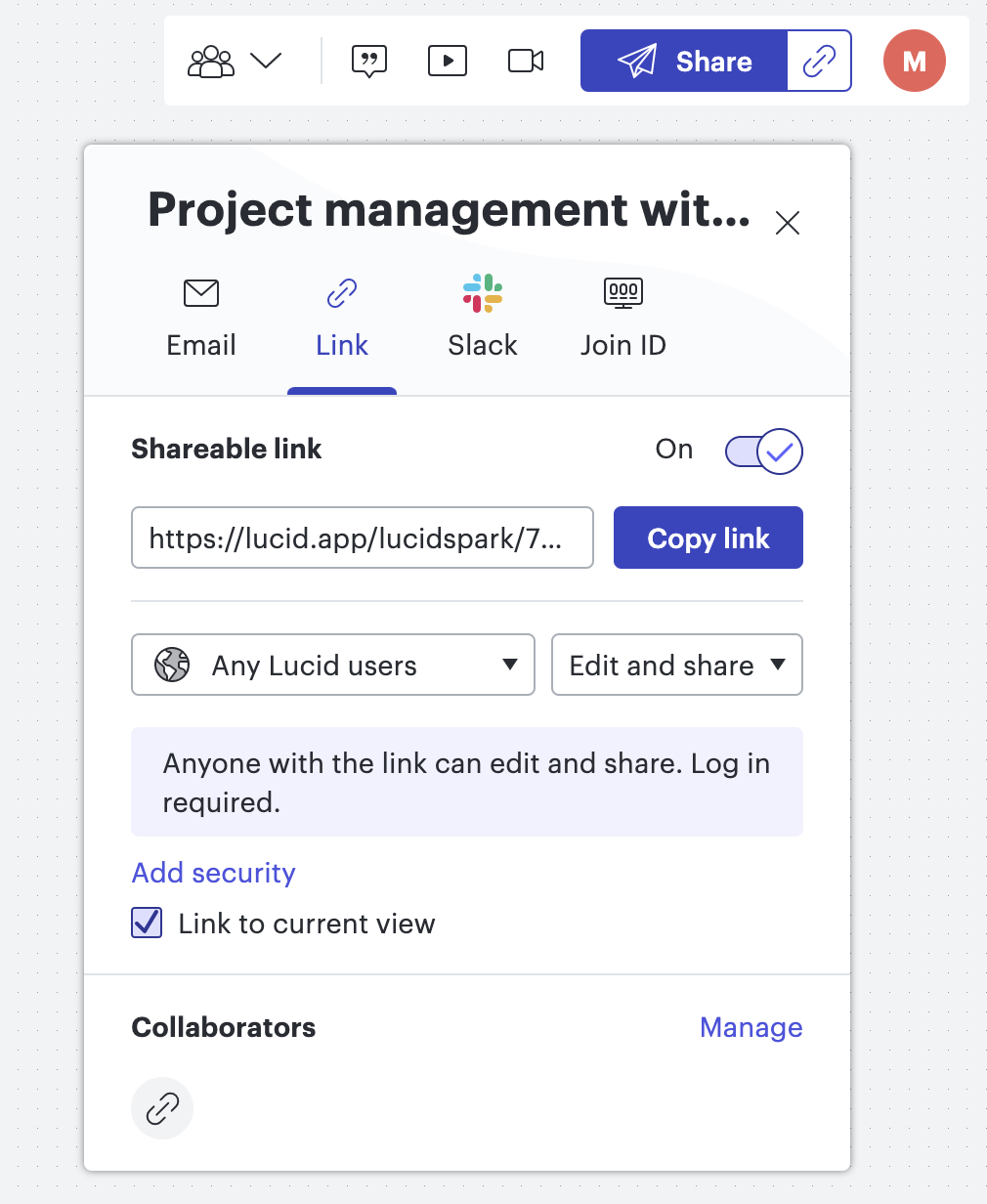Enable a shareable link and set access permissions. You can also choose to link your board to your current view so collaborators see exactly what you want them to.