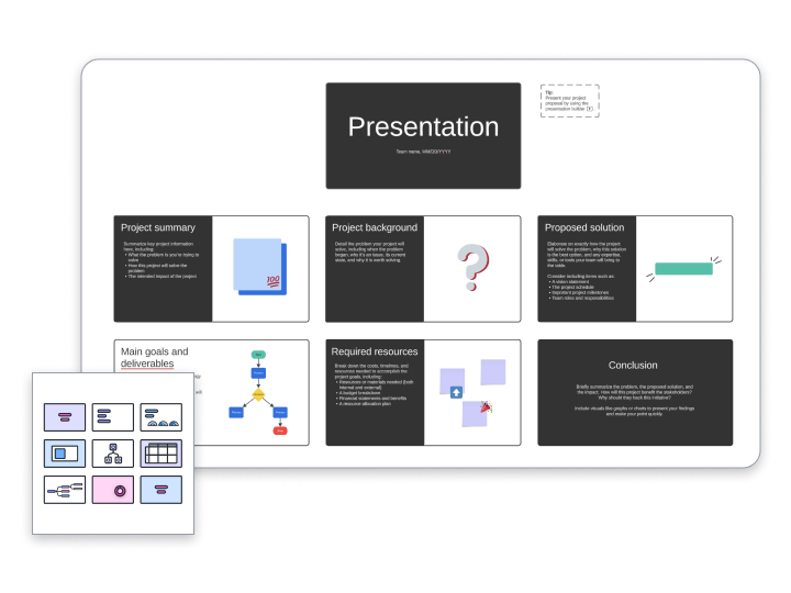 Whether you’re looking for inspiration or a quick way to build your presentation, Lucid provides visual presentation templates and examples to help you get started faster. Try our project proposal pitch deck for free at the link below.