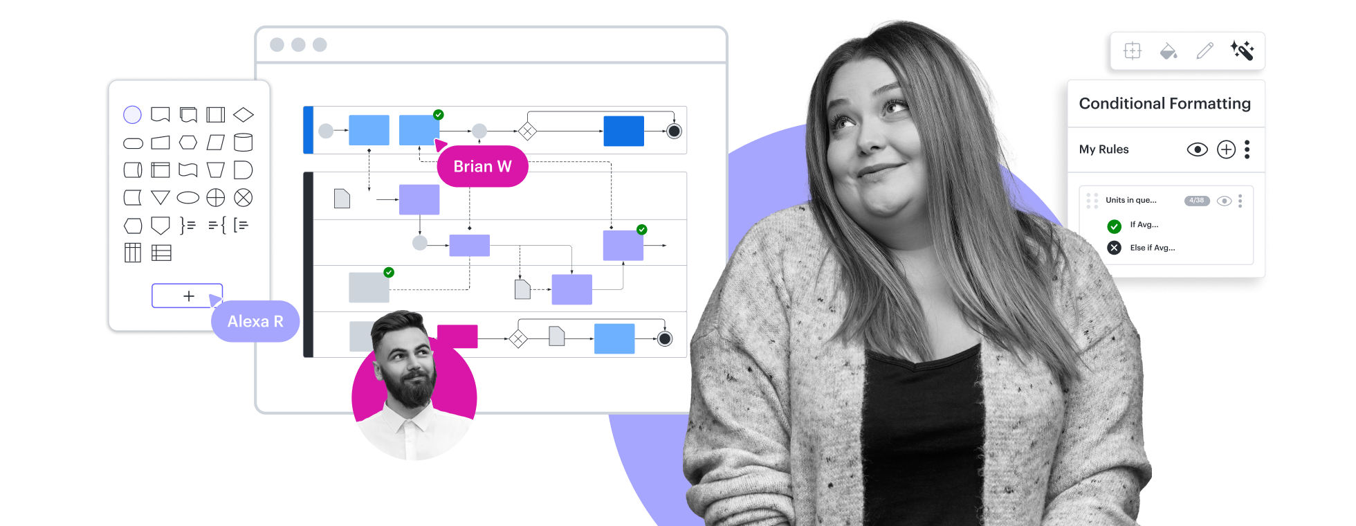 Verwenden Sie benutzerdefinierte Formen, um einen Ablauf für das Onboarding neuer Mitarbeiter zu visualisieren. Verbessern Sie Ihren Prozess mit Kommentaren und der Zuweisung von Aufgaben.