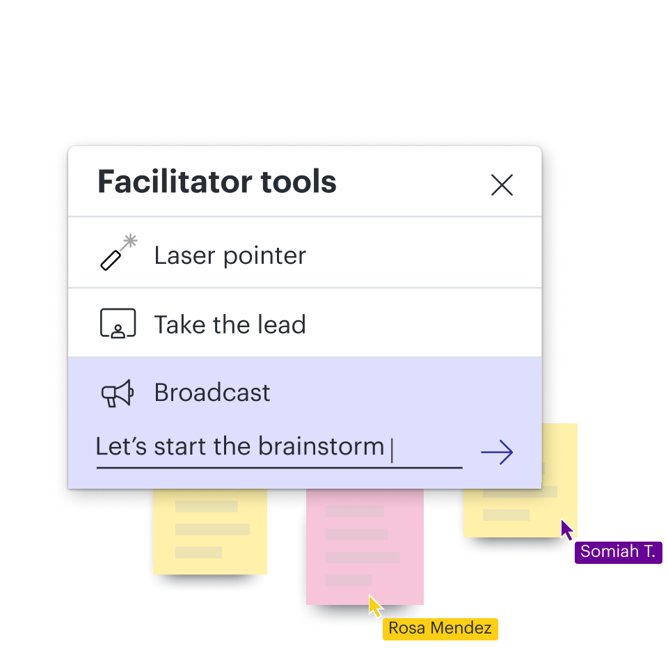 Nutzen Sie Funktionen wie den Timer, die Rahmen und das Notizfeld, um Ihre Besprechung zu organisieren, auf Kurs zu halten und produktiv zu gestalten. Mit der Broadcast-Funktion können Sie allen Teilnehmenden unabhängig von ihrem Standort zeitnahe Ankündigungen und Aktualisierungen zukommen lassen. Somit sind alle auf dem gleichen Stand.