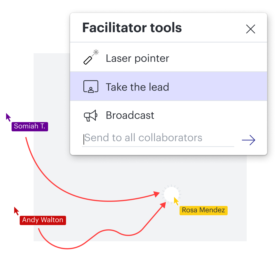 Moderation meistern mit Lucidspark. Mit Funktionen wie Broadcasting und einem Laserpointer können Sie ungleiche Teams in Richtung Innovationen und schnelle Entscheidungen leiten.