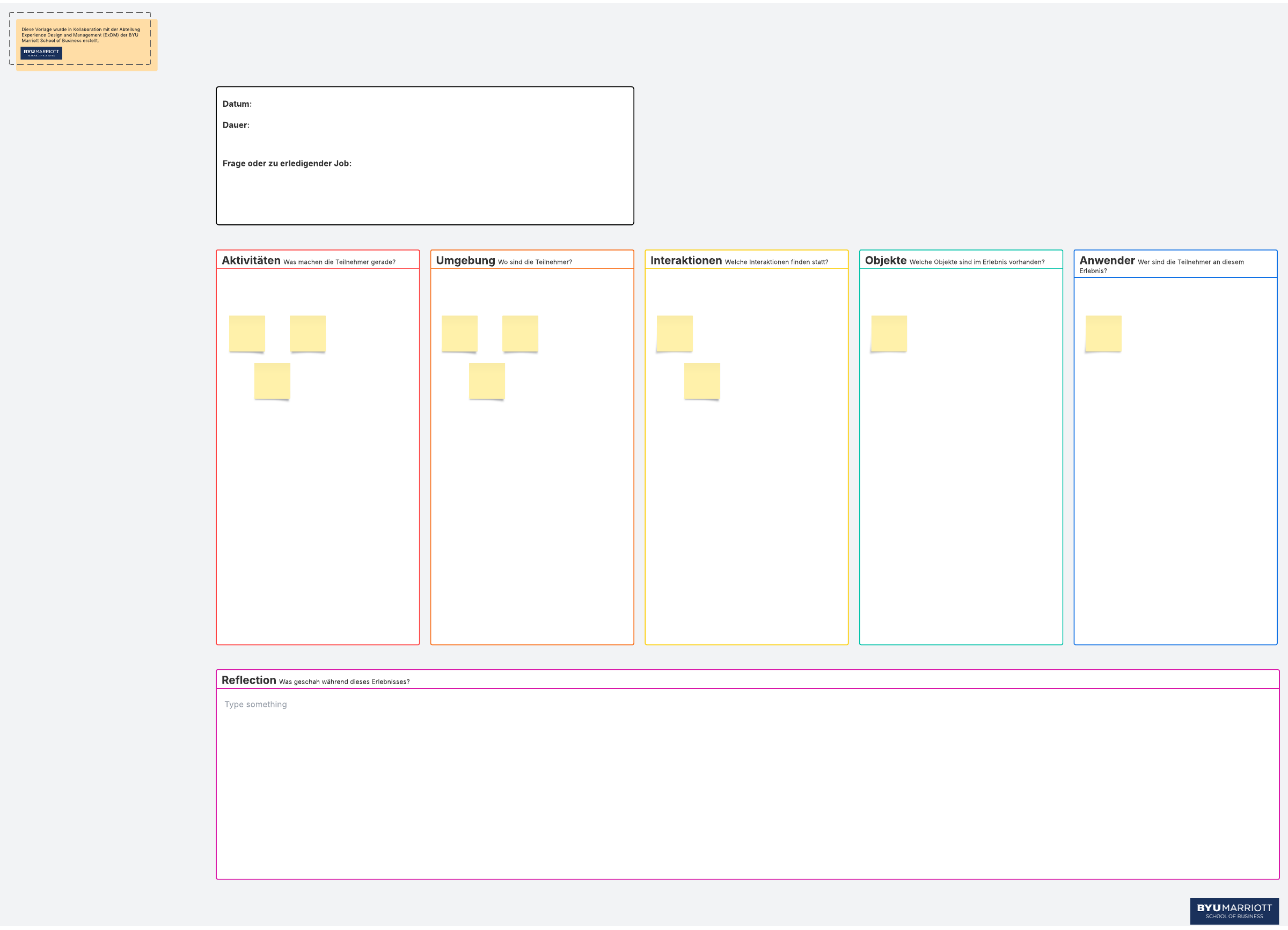 Strukturieren Sie Erkentnisse mit dieser Design Thinking Methode. Erfassen Sie nützliche Beobachtungsdaten mit dieser Vorlage für die AEIOU Methode. Beginnen Sie mit einer gezielten Forschungsfrage oder identifiziere Sie eine Aufgabe (das Bedürfnis, das ein Anwender mit diesem Erlebnis zu erfüllen hofft), mache Sie sich Notizen und reflektieren SIe Ihre Beobachtungen und Erfahrungen.