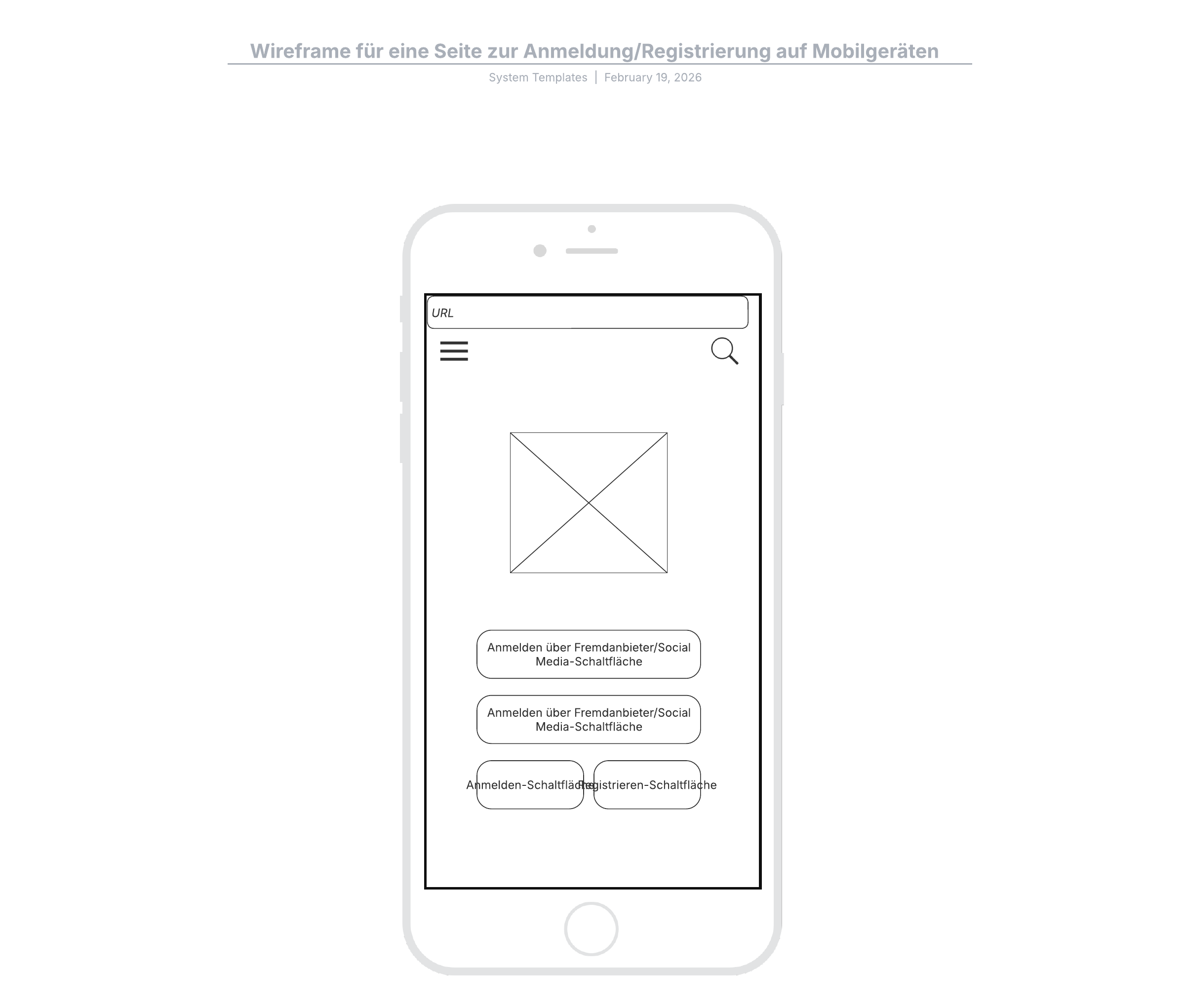 Durch Öffnen dieser Vorlage wird ein detailliertes Beispiel für ein Wireframe für eine Seite zur Anmeldung/Registrierung auf Mobilgeräten angezeigt, das Sie an Ihren Anwendungsfall anpassen können.