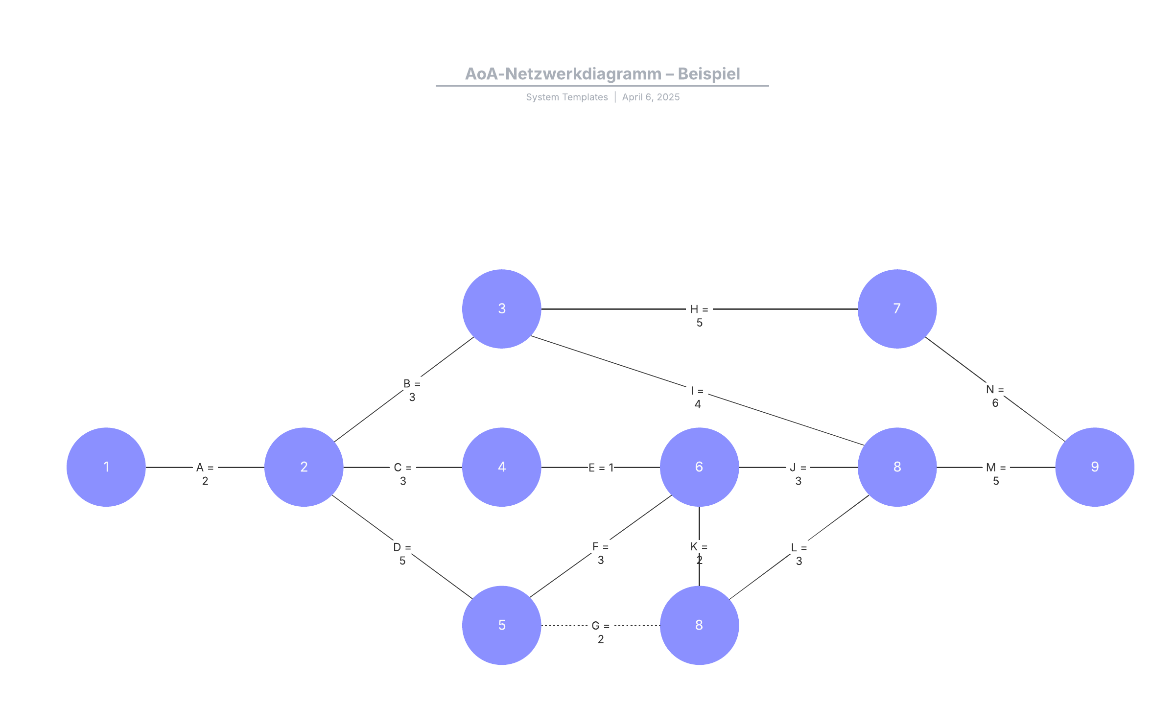 Mit dieser Vorlage für ein AoA-Netzwerkdiagramm (Activity on Arrow) können Sie:
