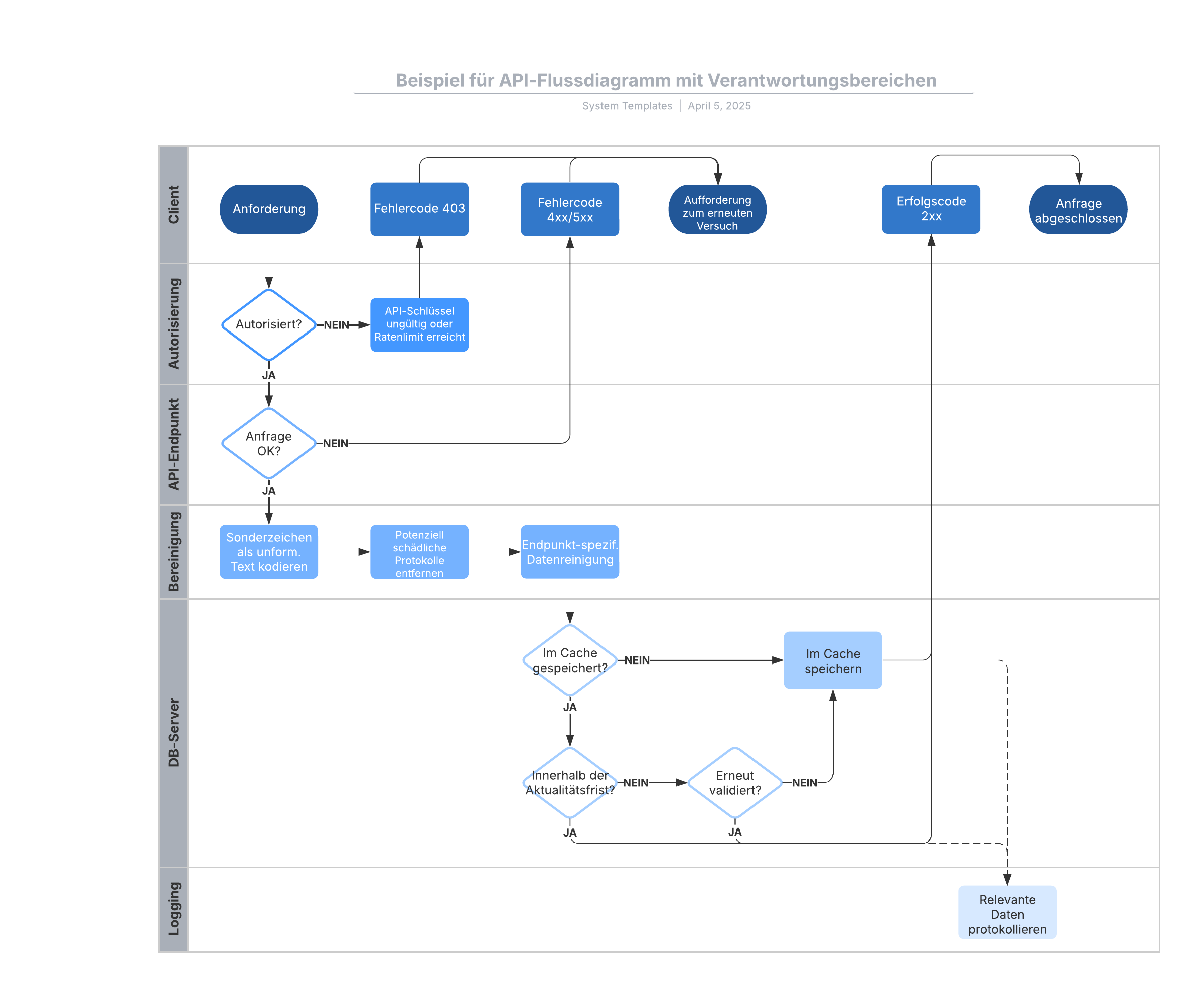 Durch Öffnen dieser Vorlage wird ein Beispiel für ein API-Flussdiagramm mit Verantwortungsbereichen angezeigt, das Sie an Ihren Anwendungsfall anpassen können.
