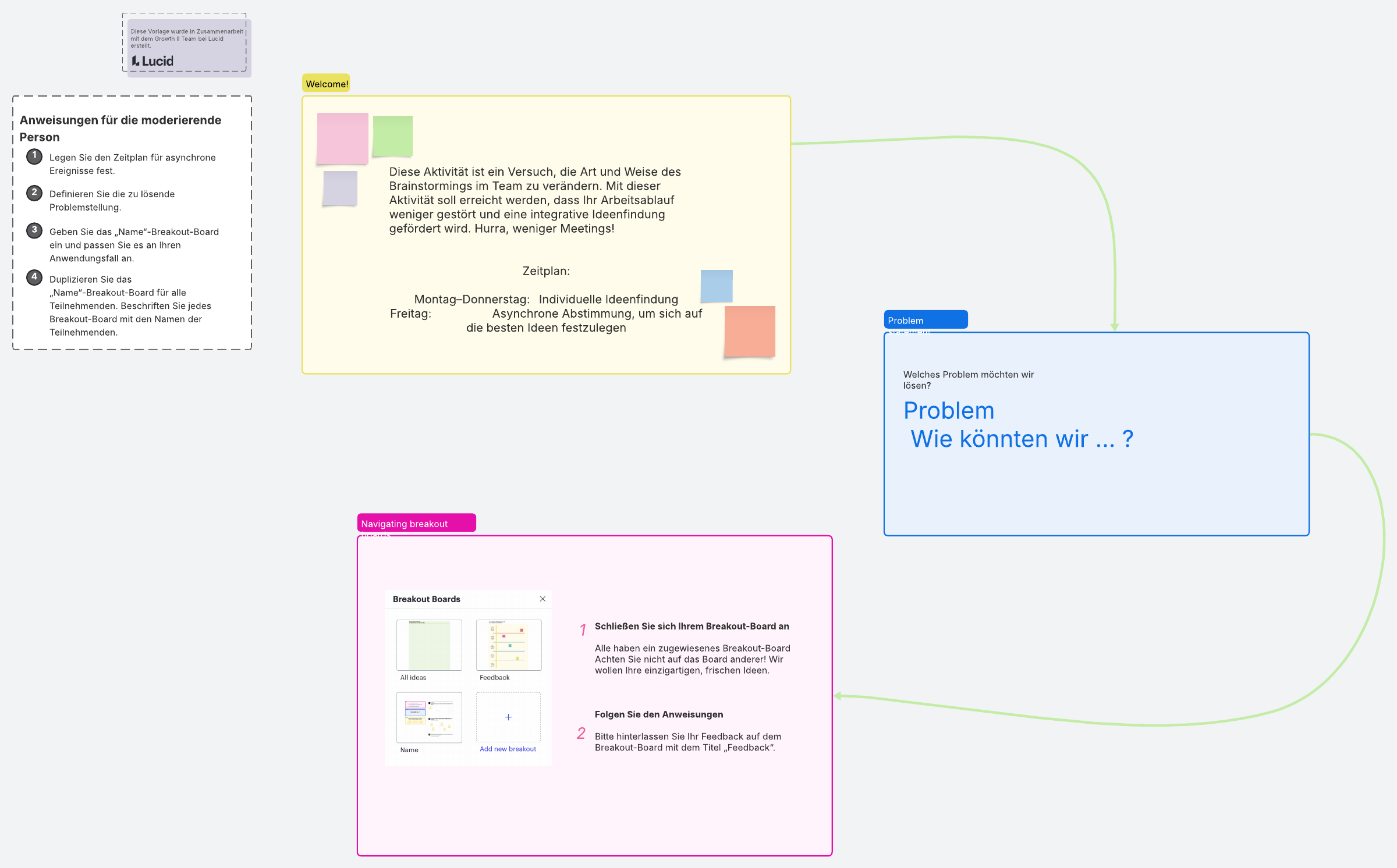Verwenden Sie die Vorlage zum asynchronen Brainstorming in Lucidspark. Wenn Teammitglieder arbeitsreiche Tage haben oder in unterschiedlichen Zeitzonen arbeiten, versuchen Sie, Ihr Brainstorming asynchron durchzuführen.