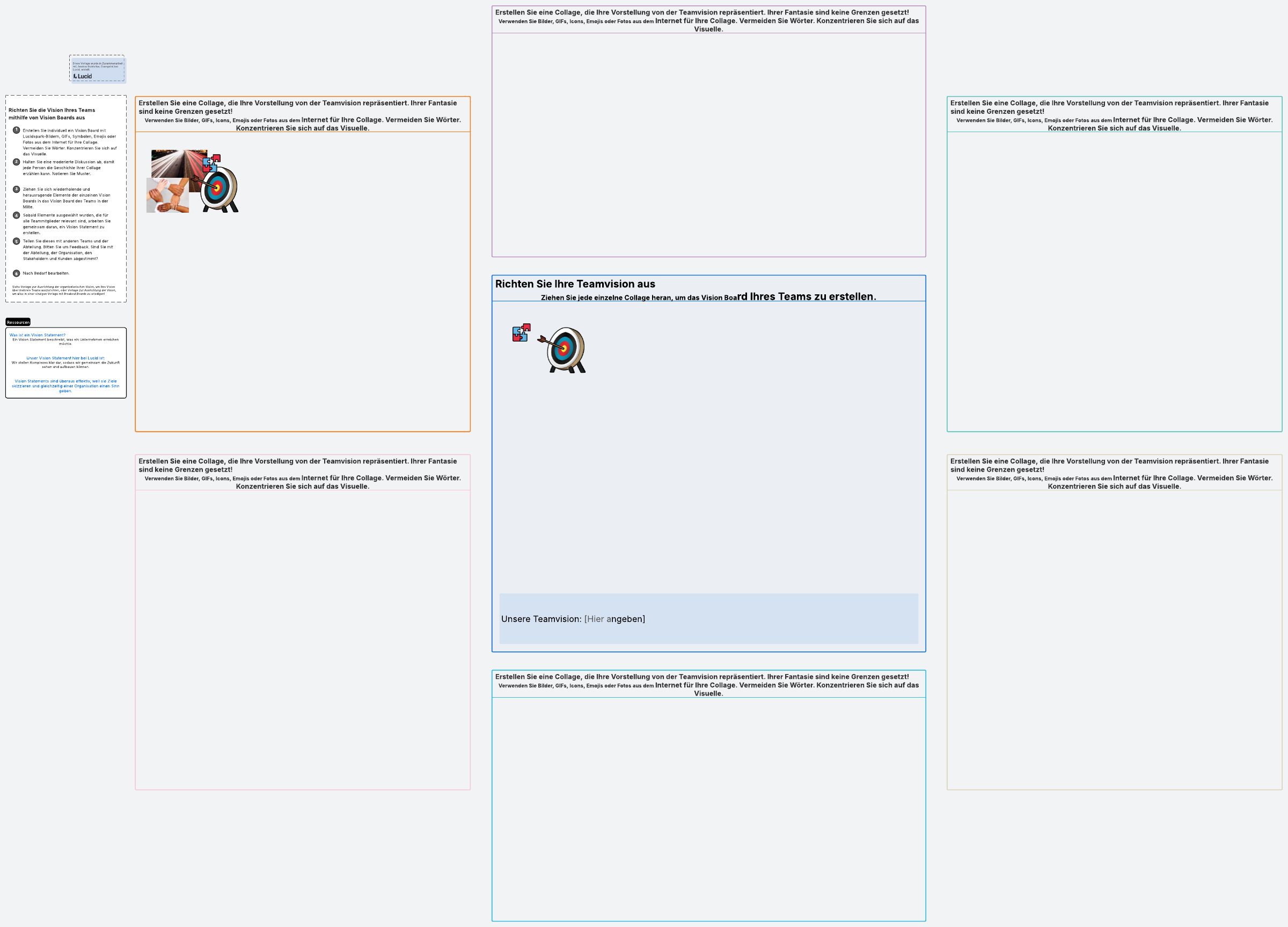 Vereinen Sie Ihr gesamtes Team unter einer ausgerichteten Teamvision mithilfe dieser Vorlage. Richten Sie die Vision Ihres Teams mithilfe der einzelnen Teammitglieder kreativ aus und stellen Sie sicher, dass alle Mitarbeitenden gehört werden und auf dem gleichen Stand sind.