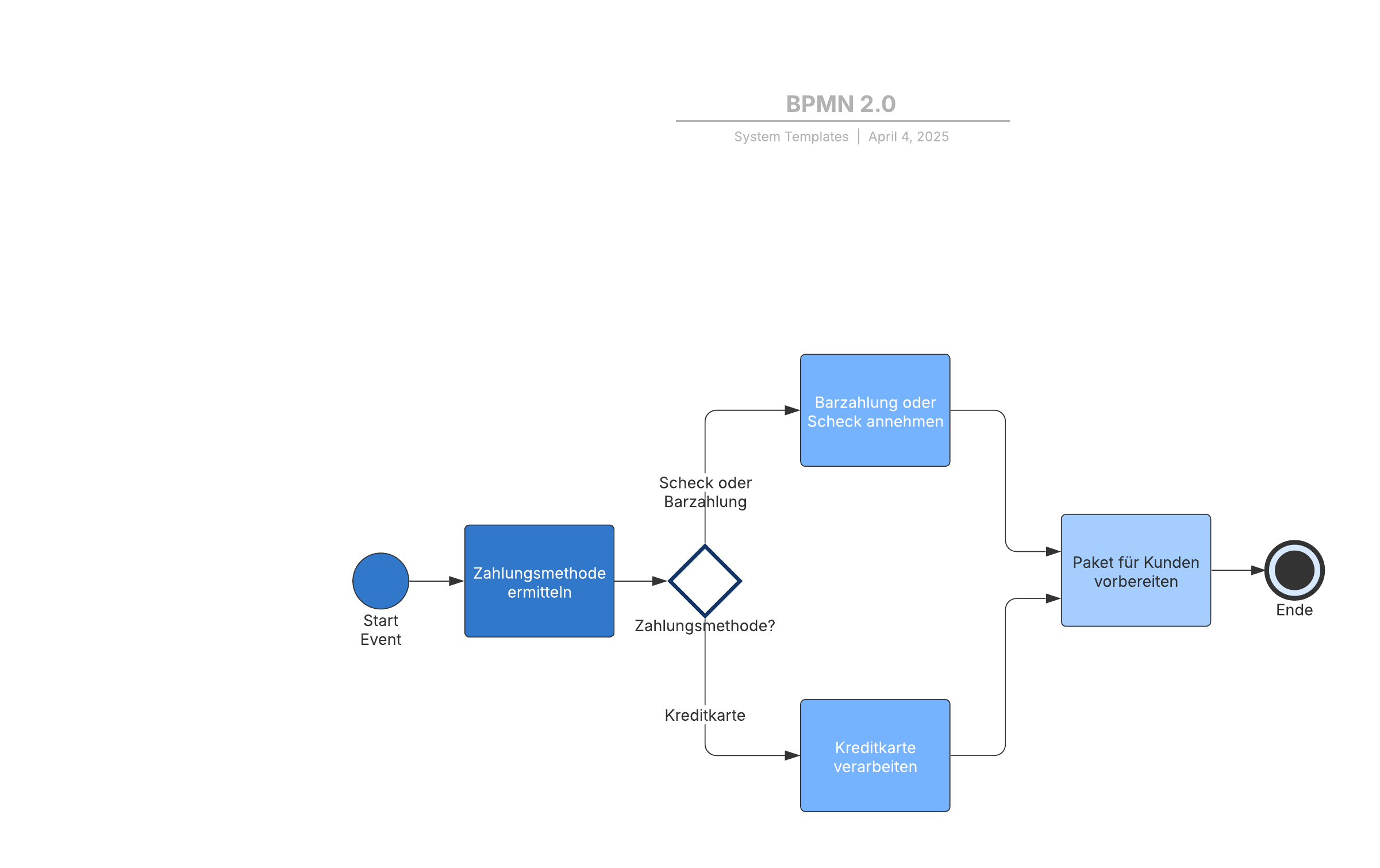 Öffnen Sie diese Vorlage, um ein detailliertes Beispiel für ein BPMN-2.0-Diagramm anzeigen zu lassen, das Sie an Ihren Anwendungsfall anpassen können.