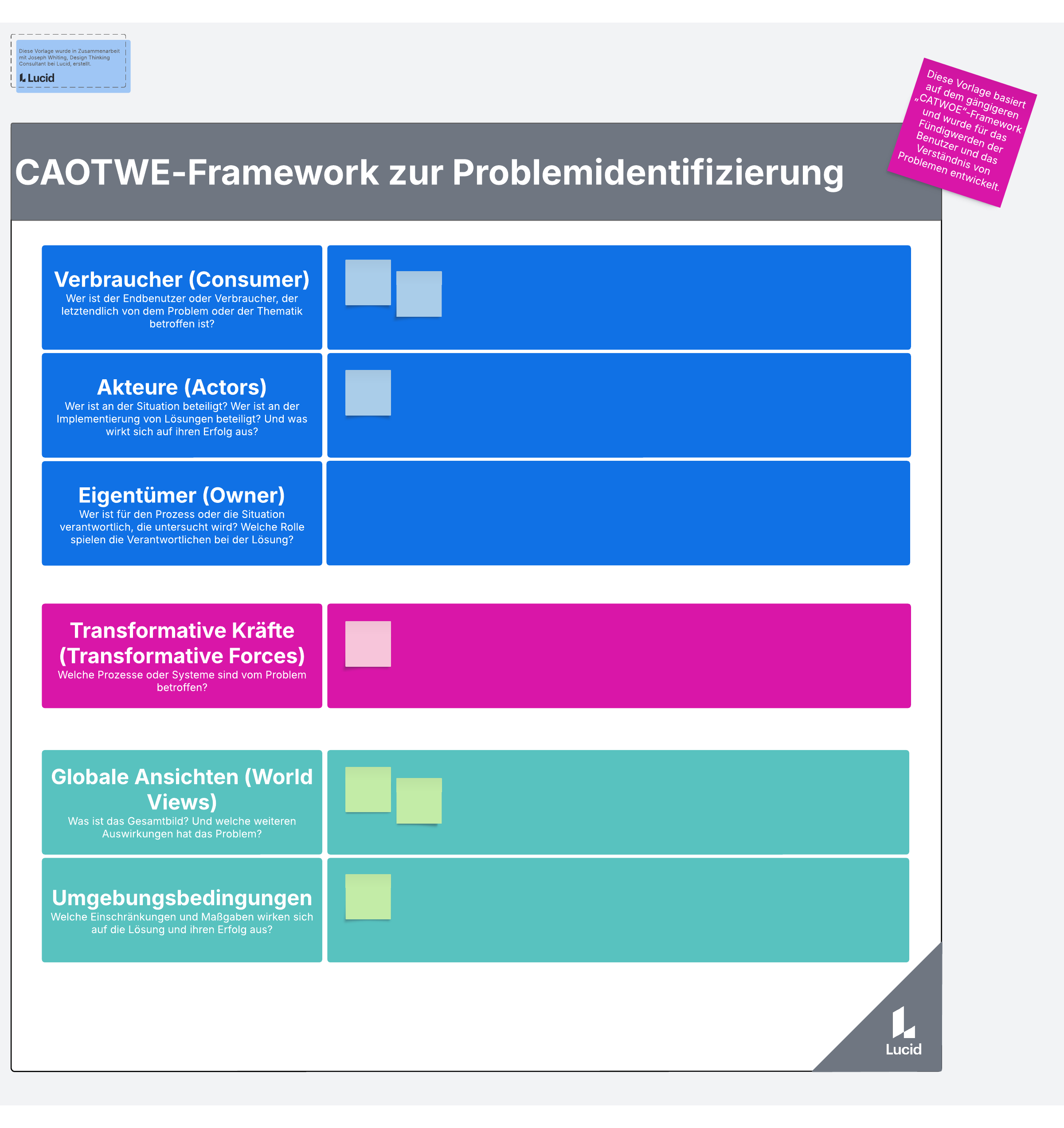 Basierend auf dem CATWOE-Framework kann dieses Tool Ihnen helfen, wichtige Faktoren im Problembereich zu identifizieren und sicherzustellen, dass Sie einen ganzheitlichen Ansatz verfolgen, um die aktuelle Herausforderung zu verstehen.