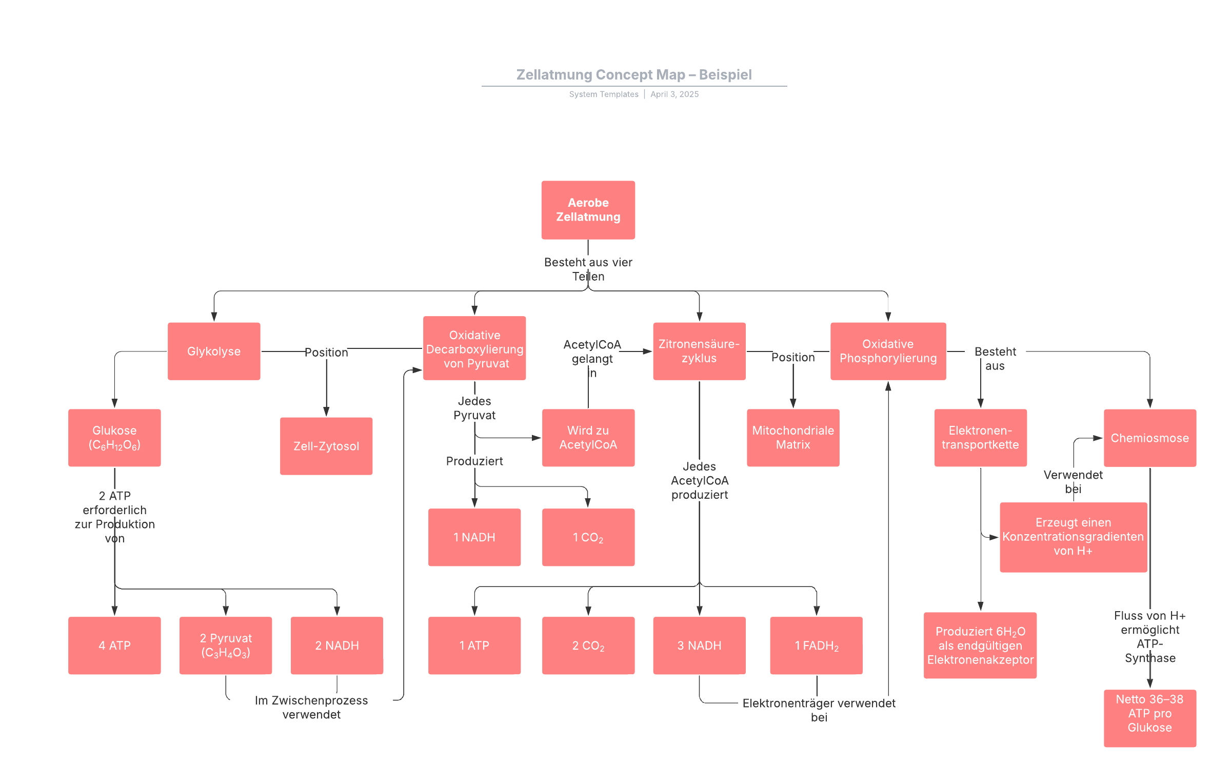 Durch Öffnen dieser Vorlage wird ein detailliertes Beispiel für eine Concept Map zur Darstelung der Zellatmung angezeigt, das Sie an Ihren Anwendungsfall anpassen können.