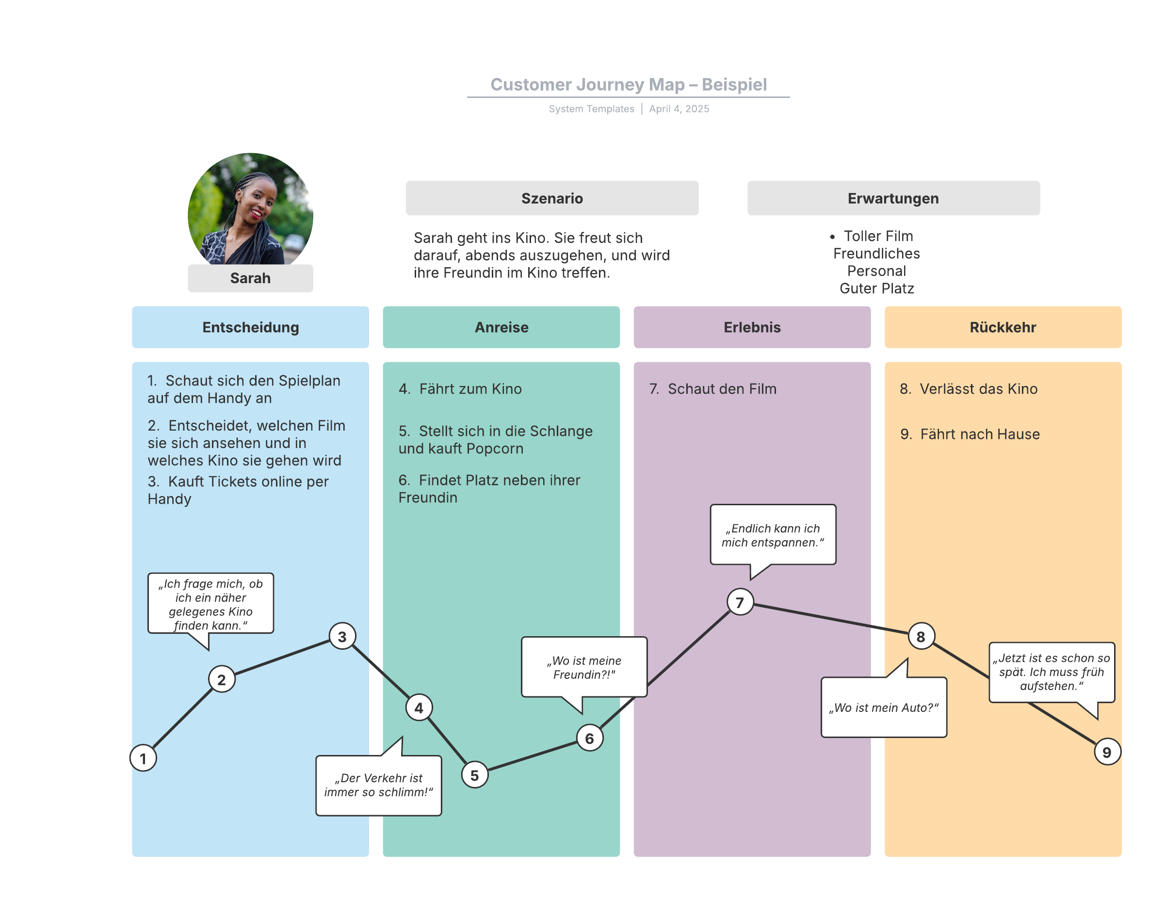 Öffnen Sie diese Vorlage, um ein detailliertes Beispiel für eine Customer Journey Map anzeigen zu lassen, die Sie an Ihren Anwendungsfall anpassen können.