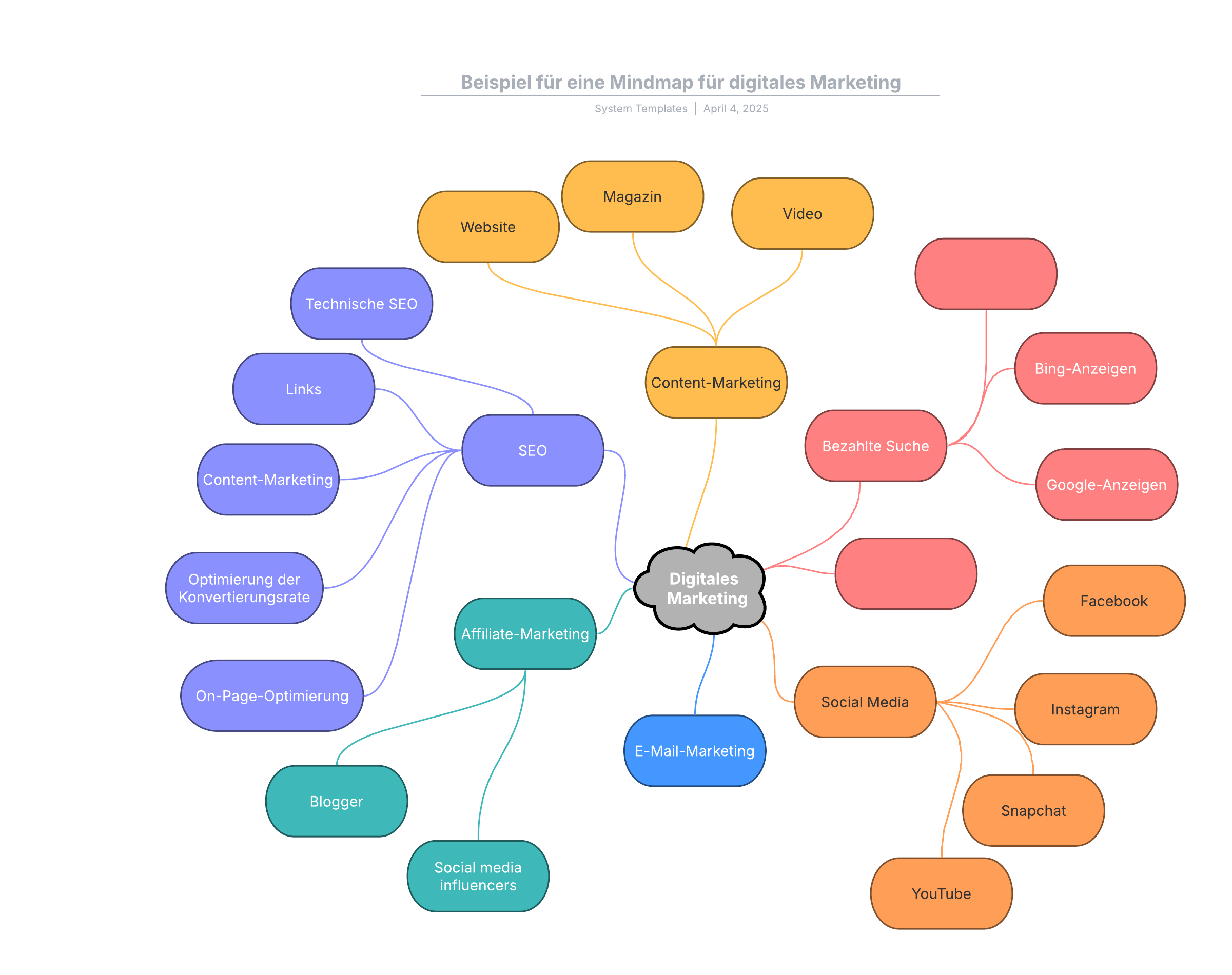 Öffnen Sie diese Vorlage, um ein detailliertes Beispiel für eine Mindmap für digitales Marketing anzeigen zu lassen, die Sie an Ihren Anwendungsfall anpassen können.