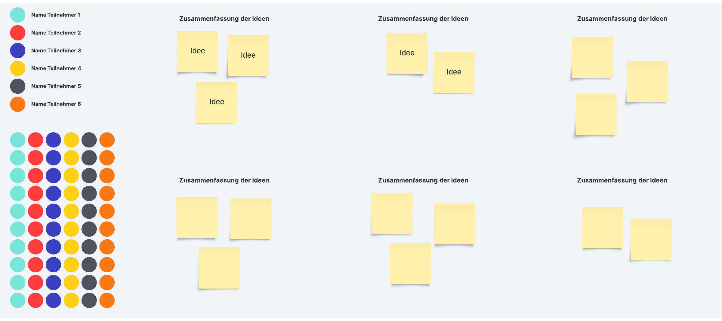 Dot-Voting ist eine hervorragende Methode zum Ordnen von Ideen und zur Konsensbildung im Team. Ähnliche Ideen werden in Clustern zusammengefasst, dann wird per Abstimmung über Favoriten entschieden.