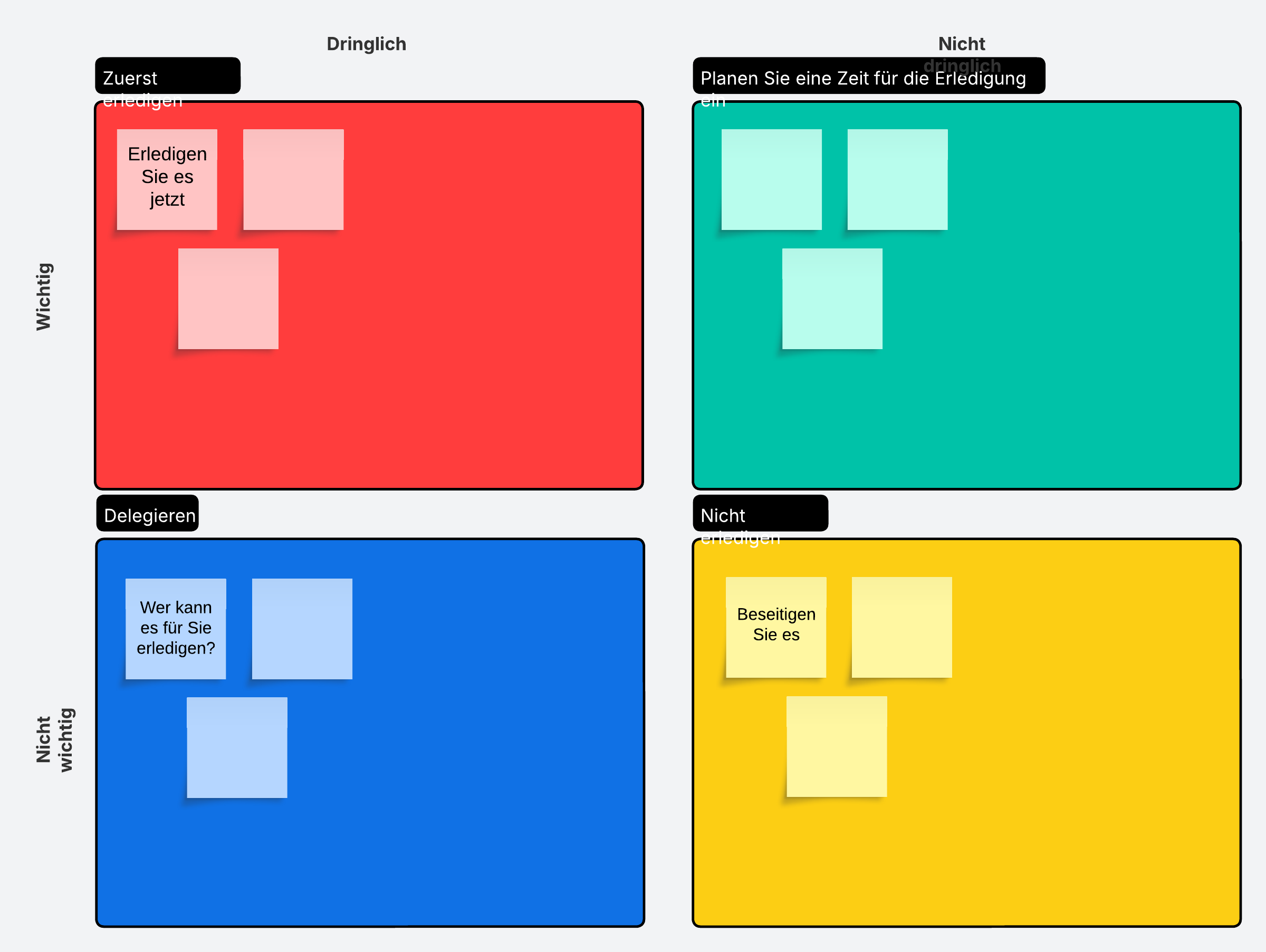 Priorisieren Sie Aufgaben mithilfe dieser Eisenhower Matrix. Organisieren Sie Aufgaben nach Dringlichkeit und Wichtigkeit, um zu klären, welche Aufgaben jetzt erledigt werden müssen, welche warten können und welche delegiert werden können.