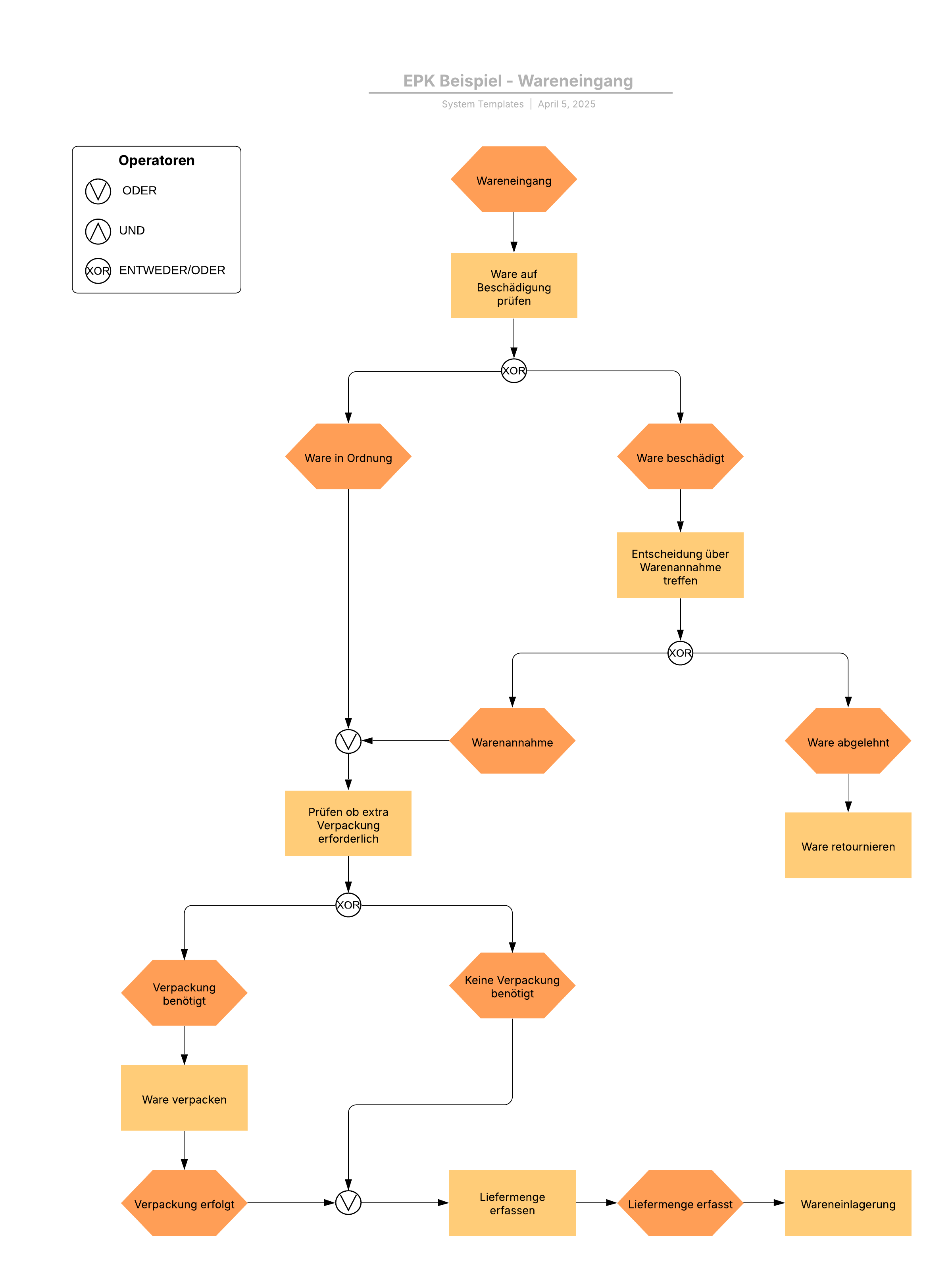 Ein EPK (Ereignisgesteuerte Prozesskette) stellt einen spezifischen Geschäftsprozess grafisch dar. Öffnen und bearbeiten Sie diese Vorlage nach Belieben.
