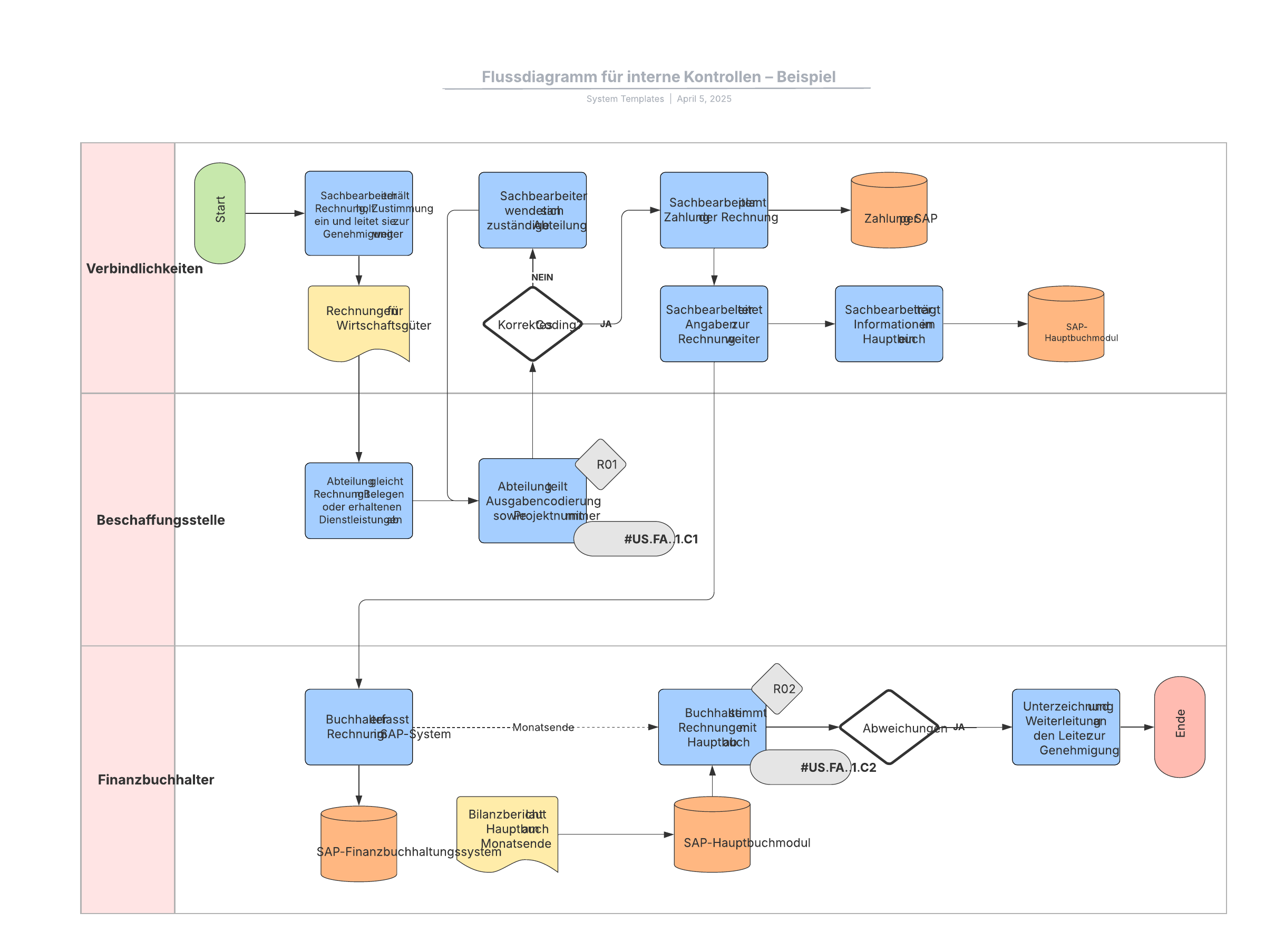 Durch Öffnen dieser Vorlage wird ein detailliertes Beispiel für ein Flussdiagramm für interne Kontrollen angezeigt, das Sie an Ihren Anwendungsfall anpassen können.