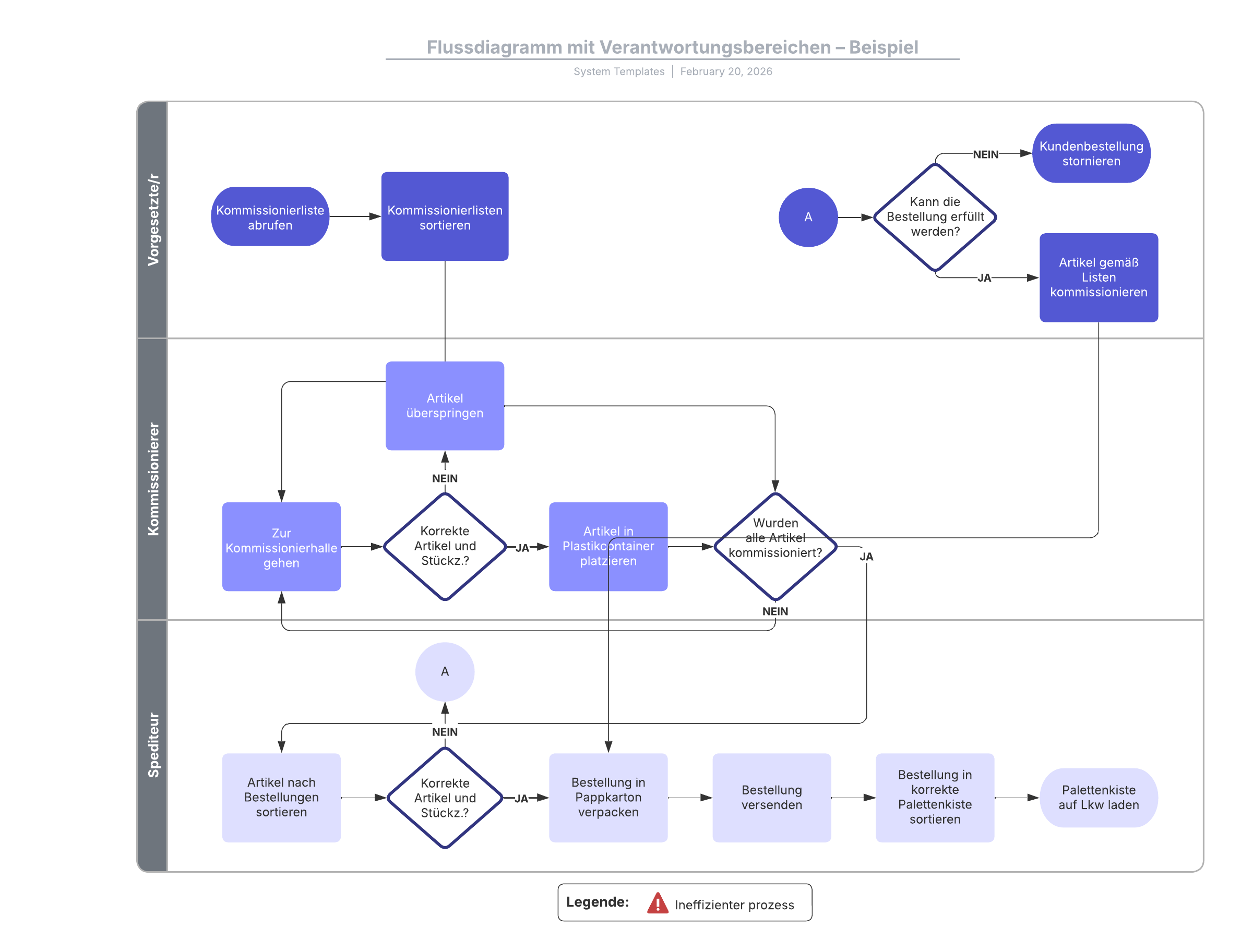 Durch Öffnen dieser Vorlage wird ein detailliertes Beispiel für ein Flussdiagramm mit Verantwortungsbereichen angezeigt, das Sie an Ihren Anwendungsfall anpassen können.
