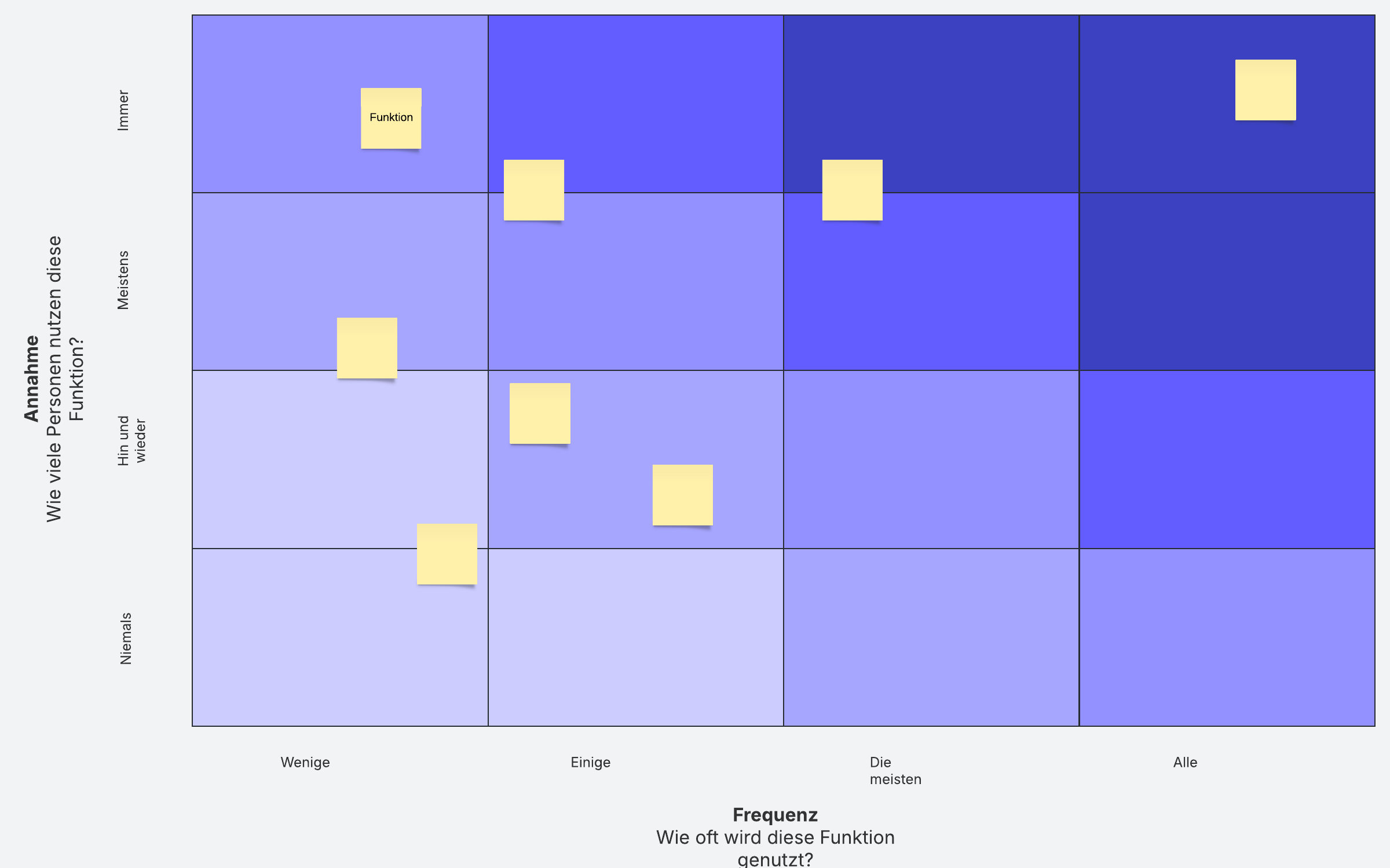 Konzentrieren Sie sich mithilfe einer Funktionsprüfung auf die Funktionen, die am wichtigsten sind. Fügen Sie Ihre Funktionen entsprechend ihrer Häufigkeit und Akzeptanz in die Matrix ein.