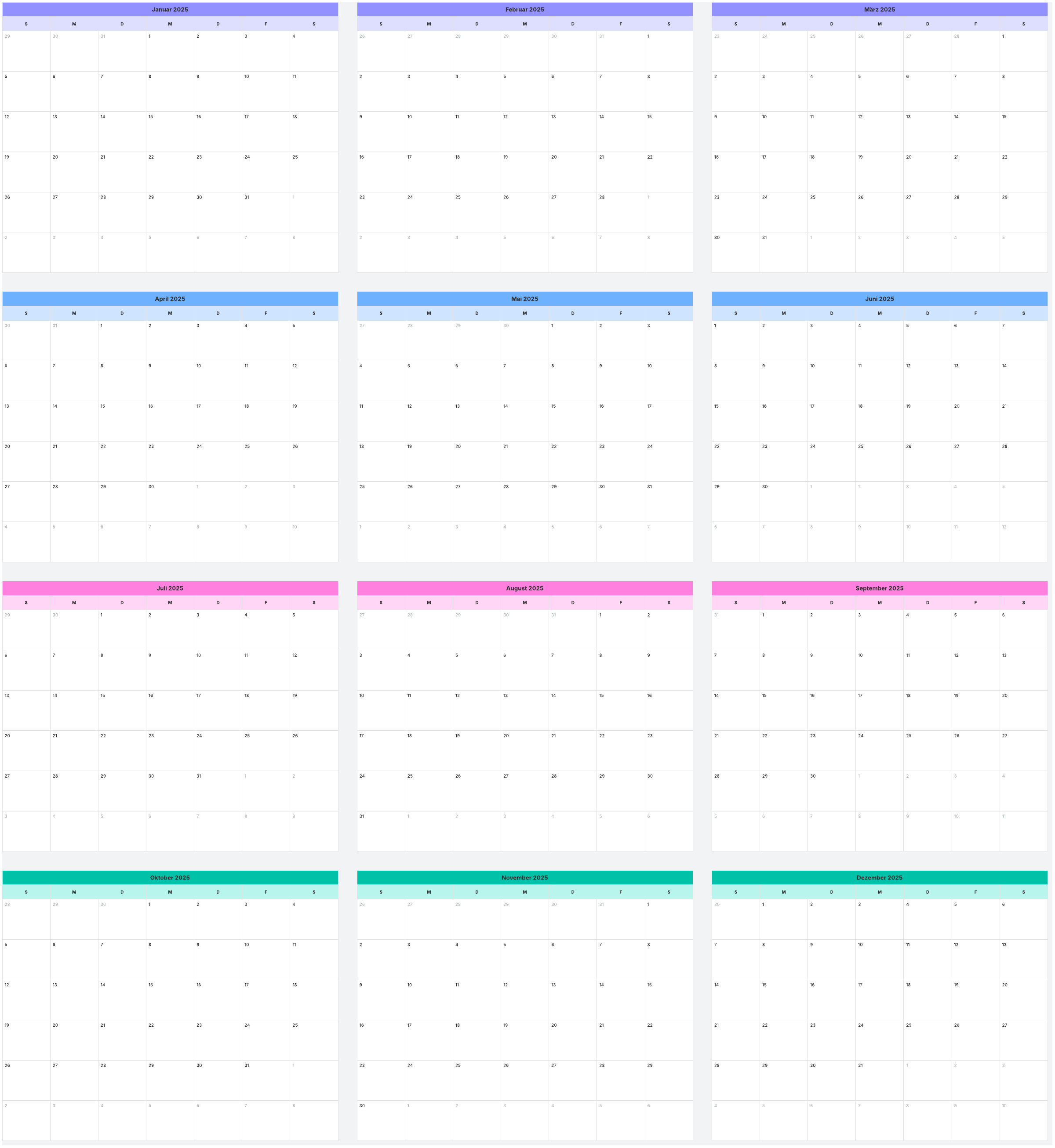 Damit 2025 zum vollen Erfolg wird, stellen wir Ihnen diese Jahreskalendervorlage bereit. Tragen Sie wichtige Projekte, Fristen und Meilensteine ein, damit Ihre Teams gut informiert und aufeinander abgestimmt bleiben. Oder verwenden Sie diese Vorlage, um den Überblick über Ihre persönlichen Aufgaben zu behalten.