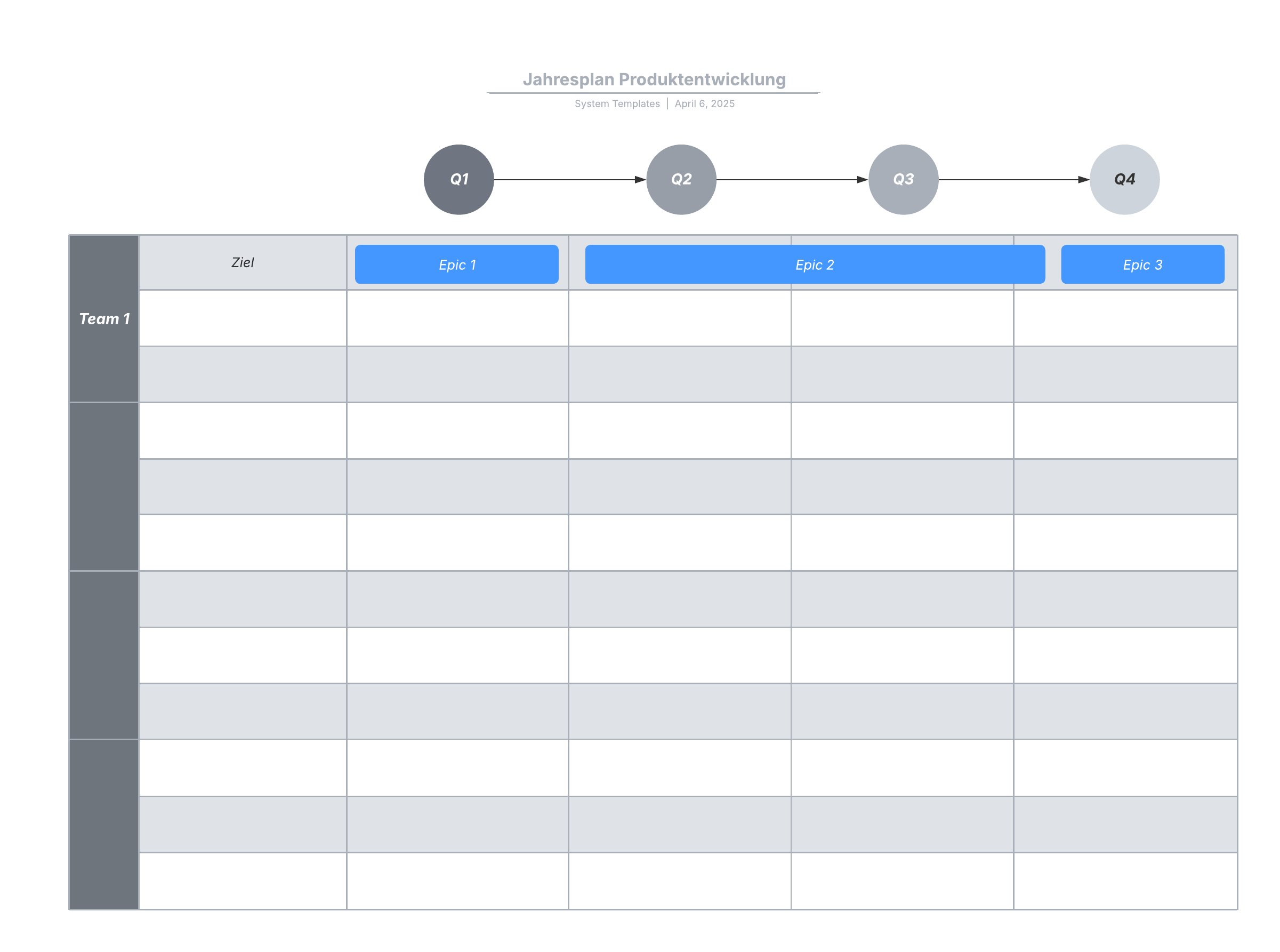 Unsere Vorlage für Produkt Roadmaps soll Ihnen dabei helfen, die Strategie Ihres Unternehmens rund um Ihr Produkt in jeder Phase seines Lebenszyklus zu visualisieren und zu organisieren. Zeigen Sie den Status der Epics und der ihnen zugewiesenen Teams an und planen Sie jedes Quartal entsprechend der Kapazität Ihres Teams mit anpassbaren Visualisierungen, die Sie schnell und einfach aktualisieren können. Laden Sie Stakeholder ein, an Ihrer Roadmap Vorlage zur Produktentwicklung mitzuarbeiten, um die Abstimmung zu fördern, Feedback zu erhalten und wichtige Aktionselemente zuzuweisen.