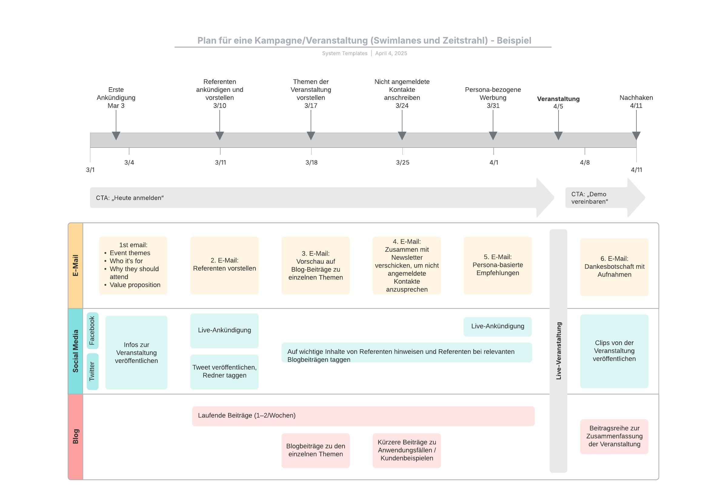 Durch Öffnen dieser Vorlage wird ein detailliertes Beispiel für einen Kampagnen-/Veranstaltungsplan angezeigt, das Sie an Ihren Anwendungsfall anpassen können.