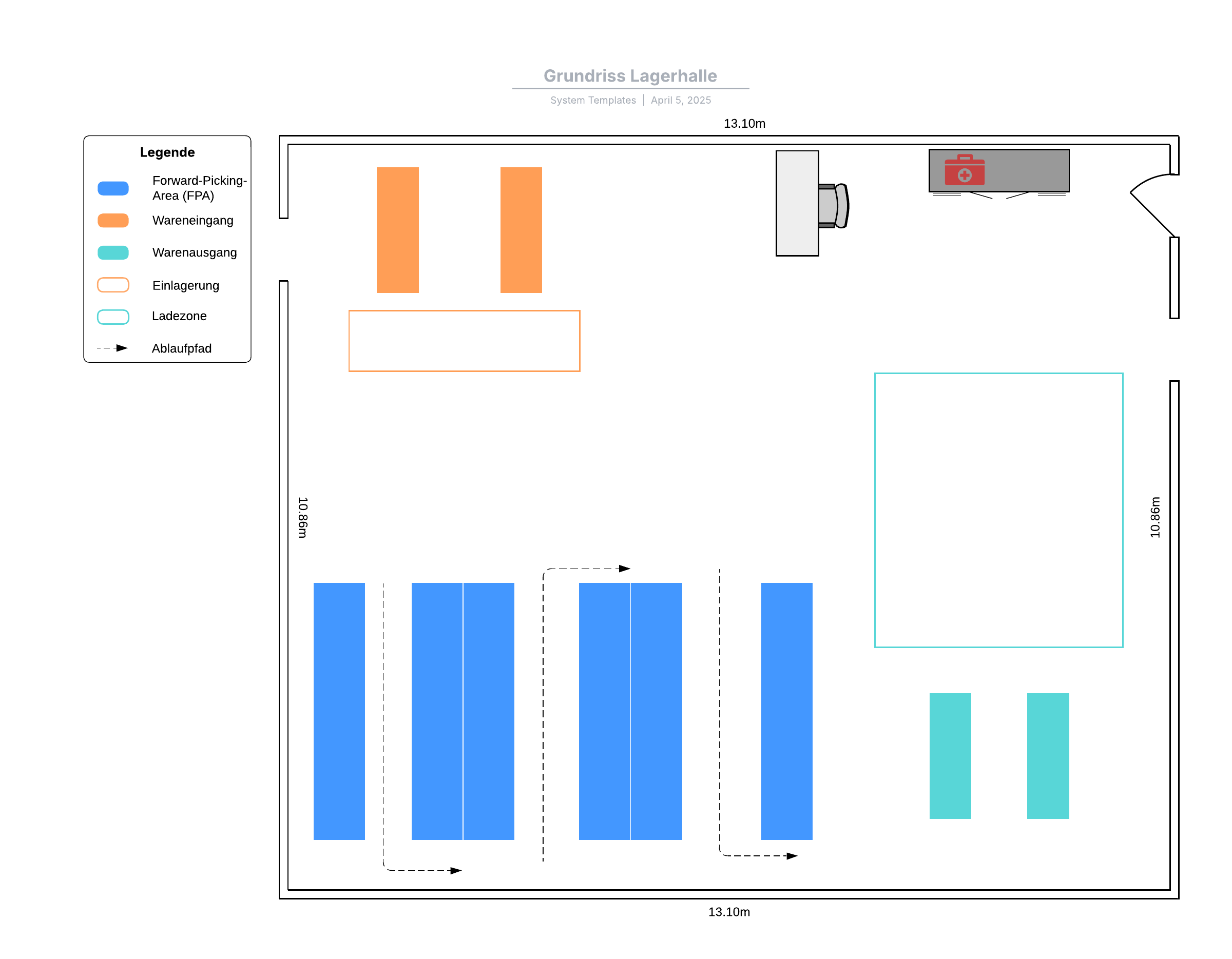 Öffnen Sie diese Vorlage und fügen Sie Inhalte hinzu, um den Grundriss für eine Lagerhalle an Ihren Anwendungsfall anzupassen.