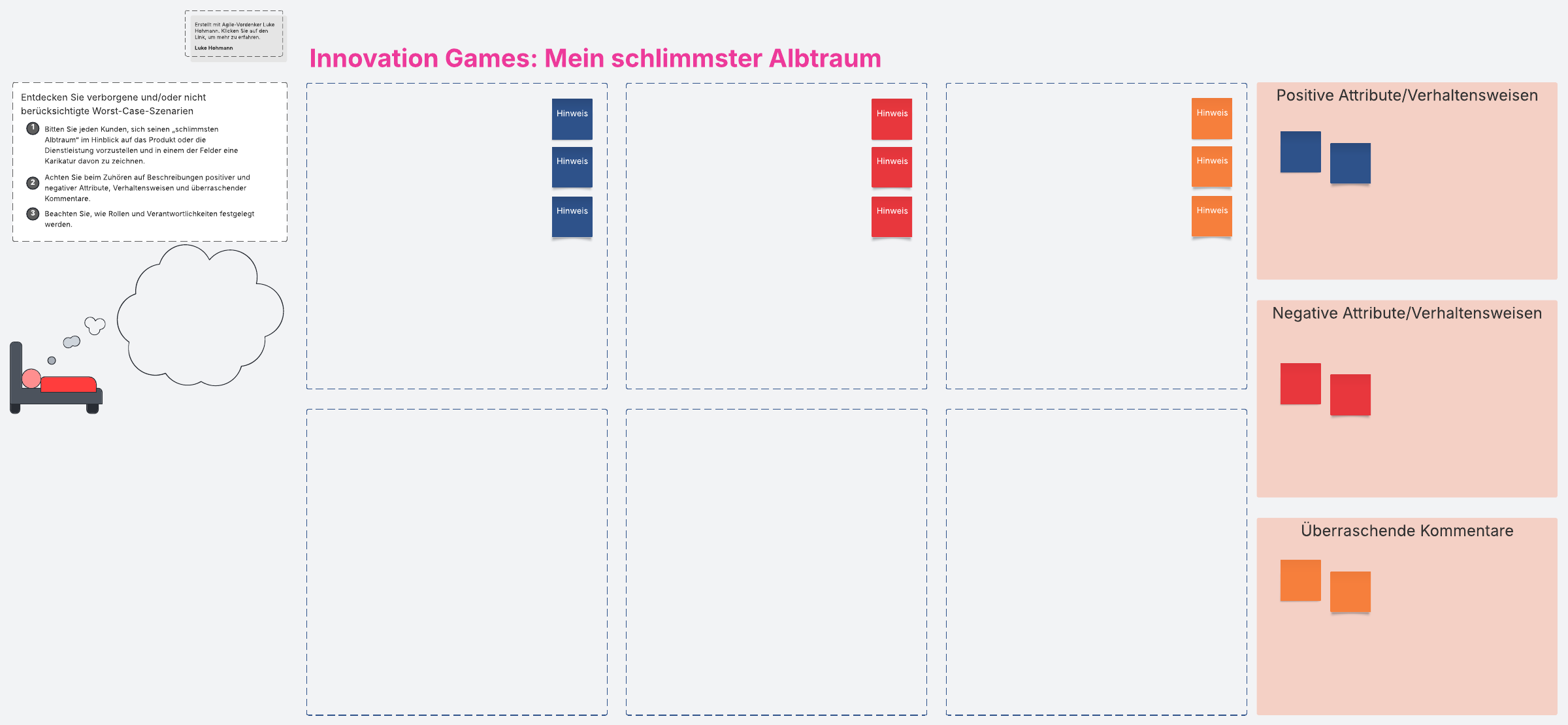 Entdecken Sie mit diesem spielbasierten Ansatz von Innovation Games die verborgenen und/oder Worst-Case-Szenarien, die sich Ihre Kunden vorstellen können.