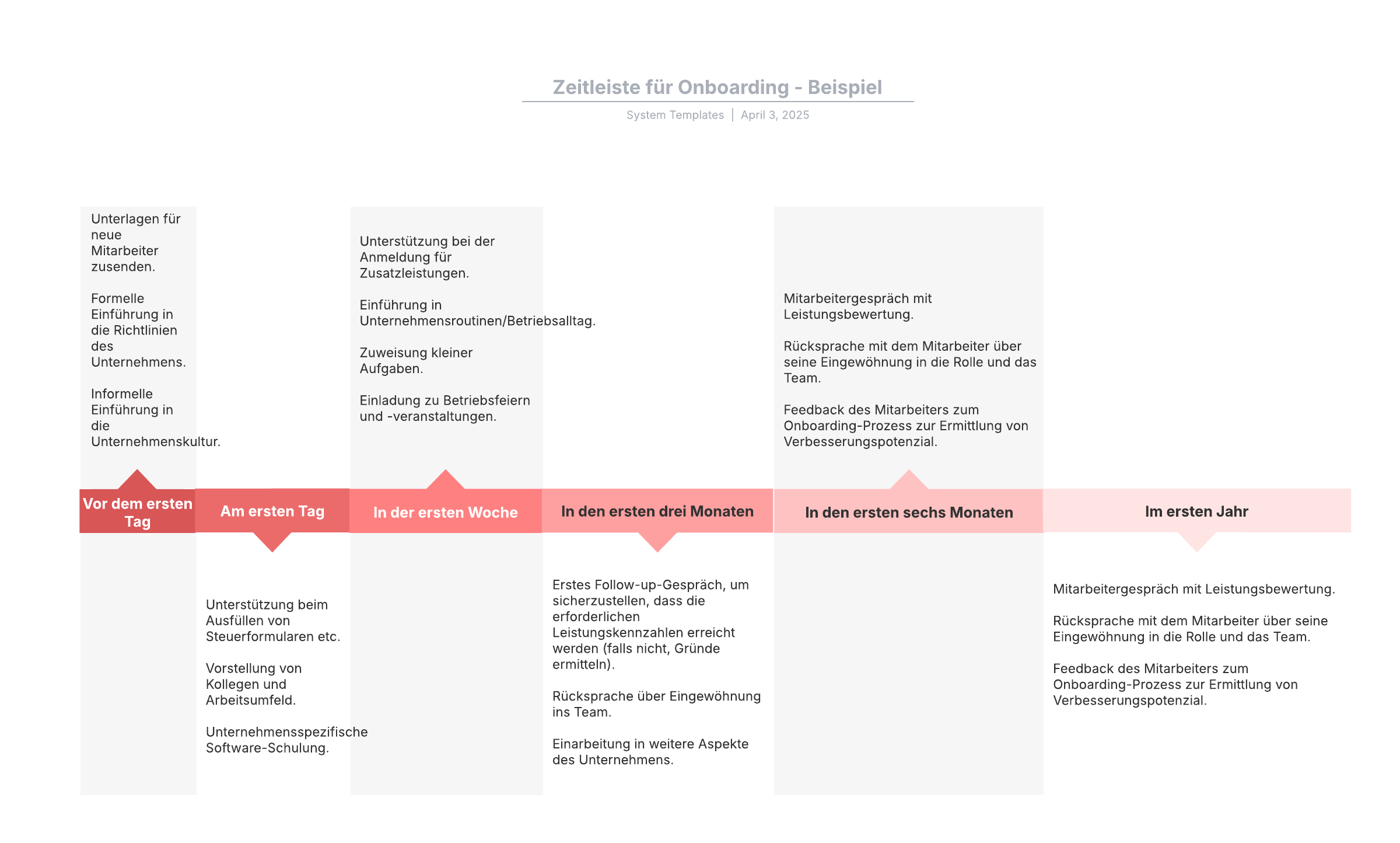 Durch Öffnen dieser Vorlage wird ein Beispiel für eine Überblicksdarstellung des Einarbeitungsprozesses angezeigt, das Sie an Ihren Anwendungsfall anpassen können.