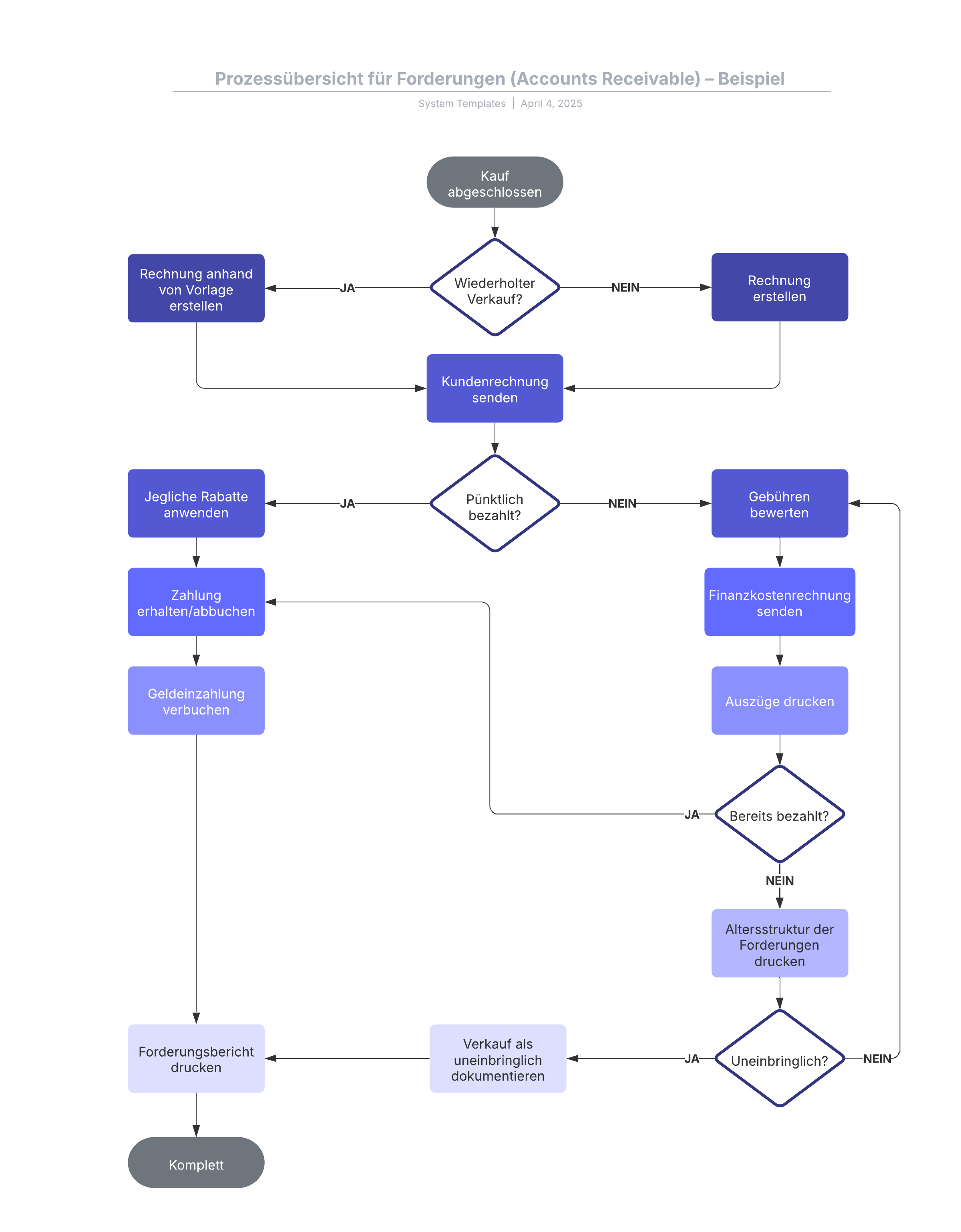 Öffnen Sie diese Vorlage, um ein detailliertes Beispiel für eine Forderungs-Prozessübersicht anzeigen zu lassen, die Sie an Ihren Anwendungsfall anpassen können.