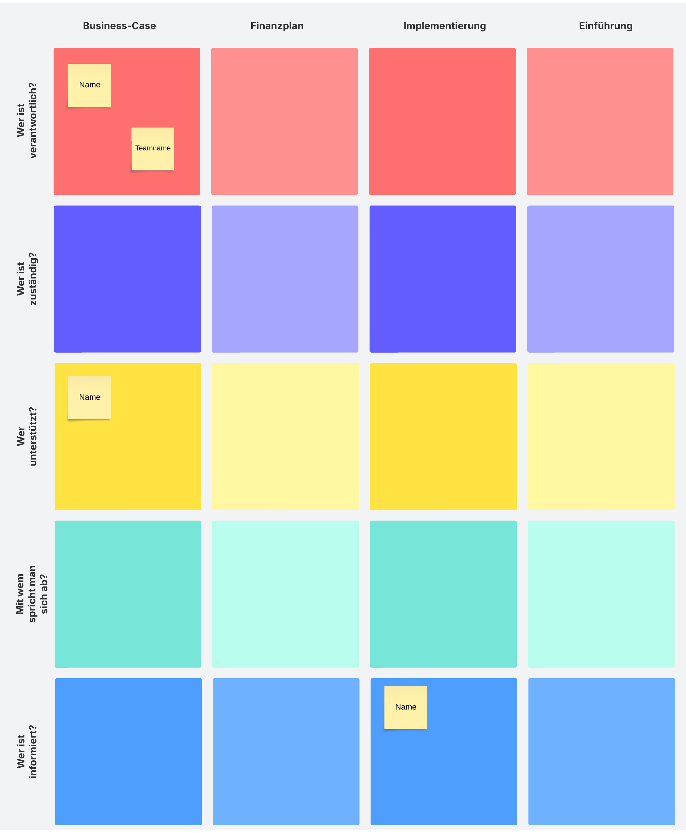 Mit der RASCI-Vorlage können Sie sich ein klares Verständnis der Verantwortlichkeiten in einem Team verschaffen. Legen Sie damit fest, welche Positionen innerhalb Ihres Teams verantwortlich bzw. zuständig sind, unterstützen, zurate gezogen werden und informiert werden.