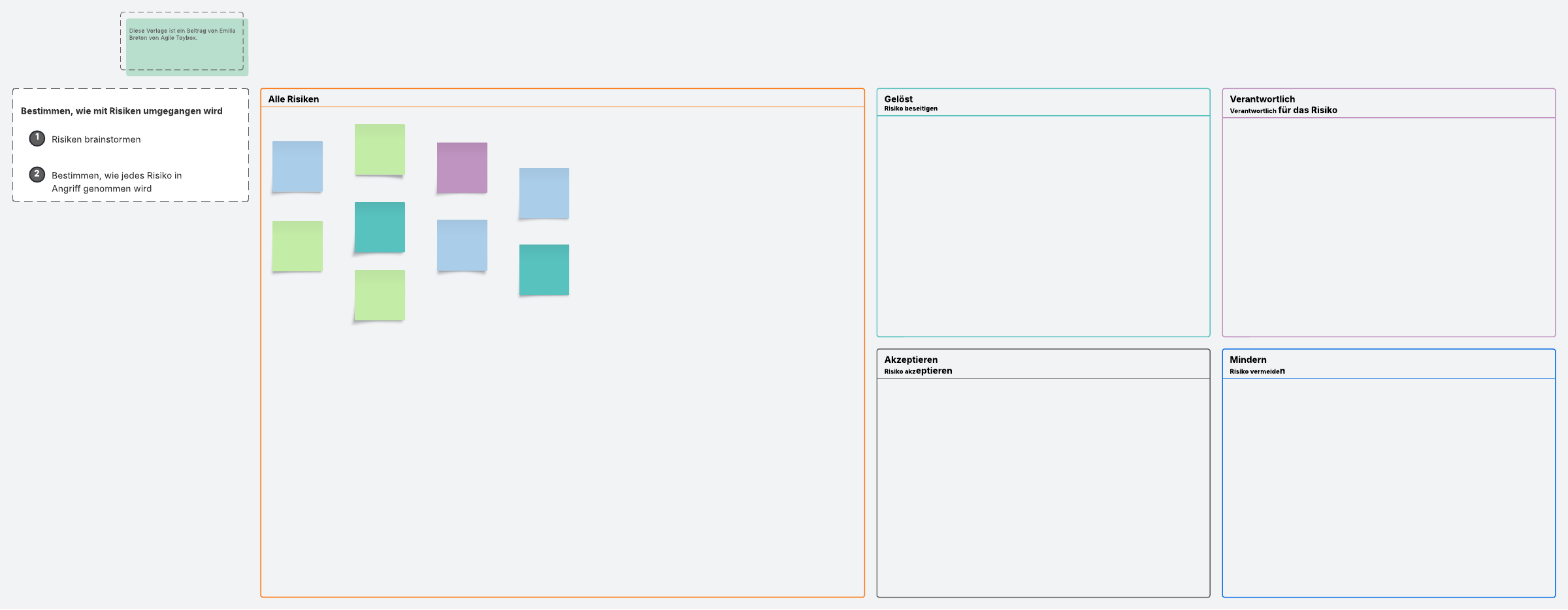 Erstellen Sie mit dieser ROAM-Board-Vorlage einen Aktionsplan zur Bewältigung von Teamrisiken. Sammeln und Organisieren Sie potentielle Risiken in diesem Lucidspark Board und planen Sie gemeinsam mit Beteiligten, wie diese Risiken am besten zu bewältigen sind.