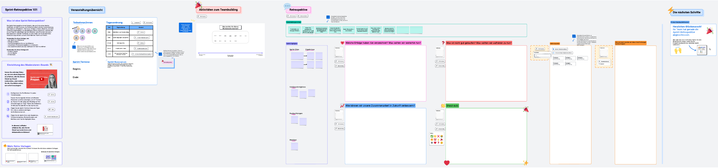 Diese Vorlage für eine Retrospektive kommt am Ende des Team-Sprints zum Einsatz. Bitten Sie die Teammitglieder um Reflexion und Feedback zur Verbesserung von Prozessen und zukünftigen Sprints.