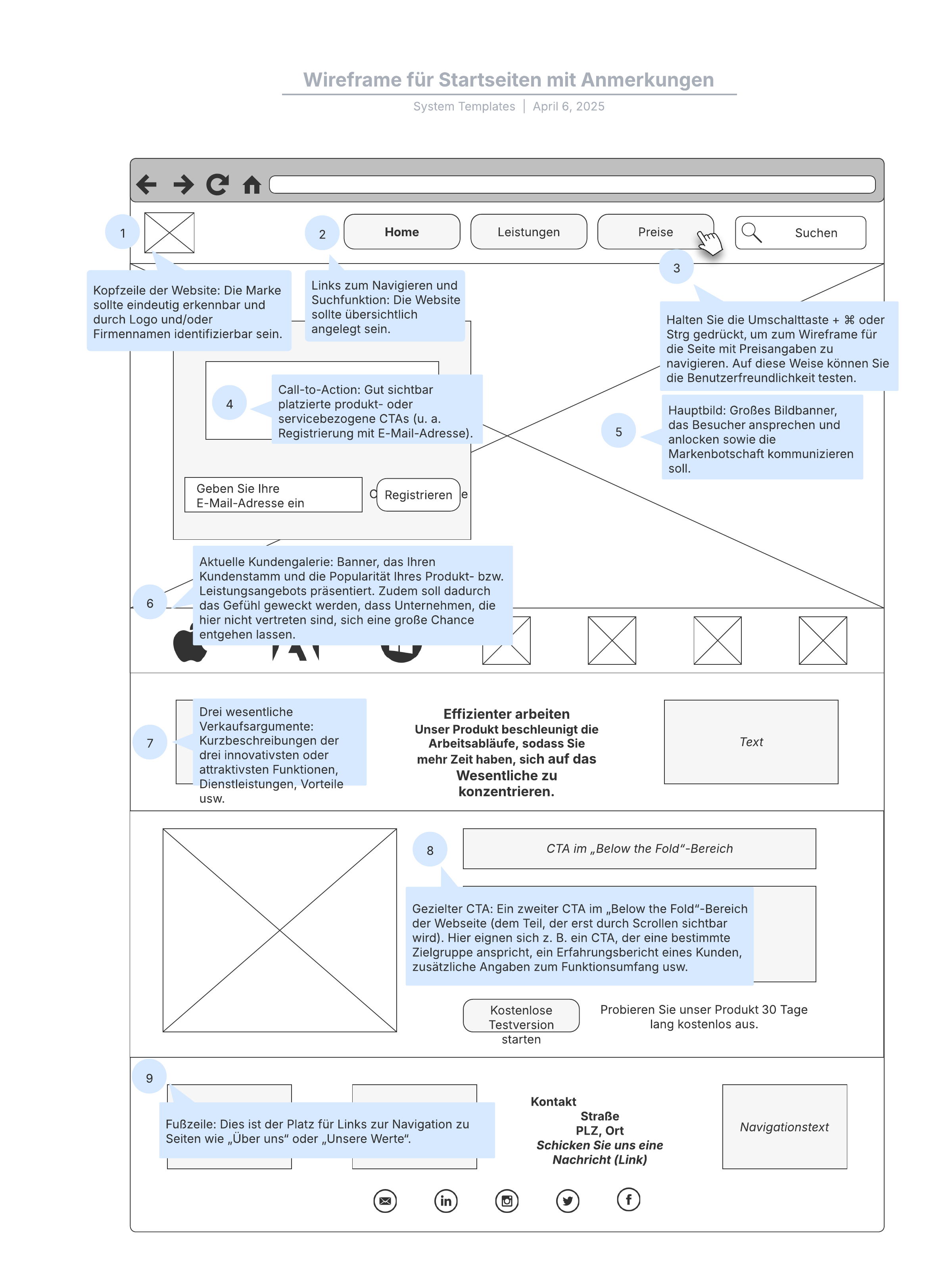 Mit diesem Wireframe für eine Startseite mit Anmerkungen können Sie: