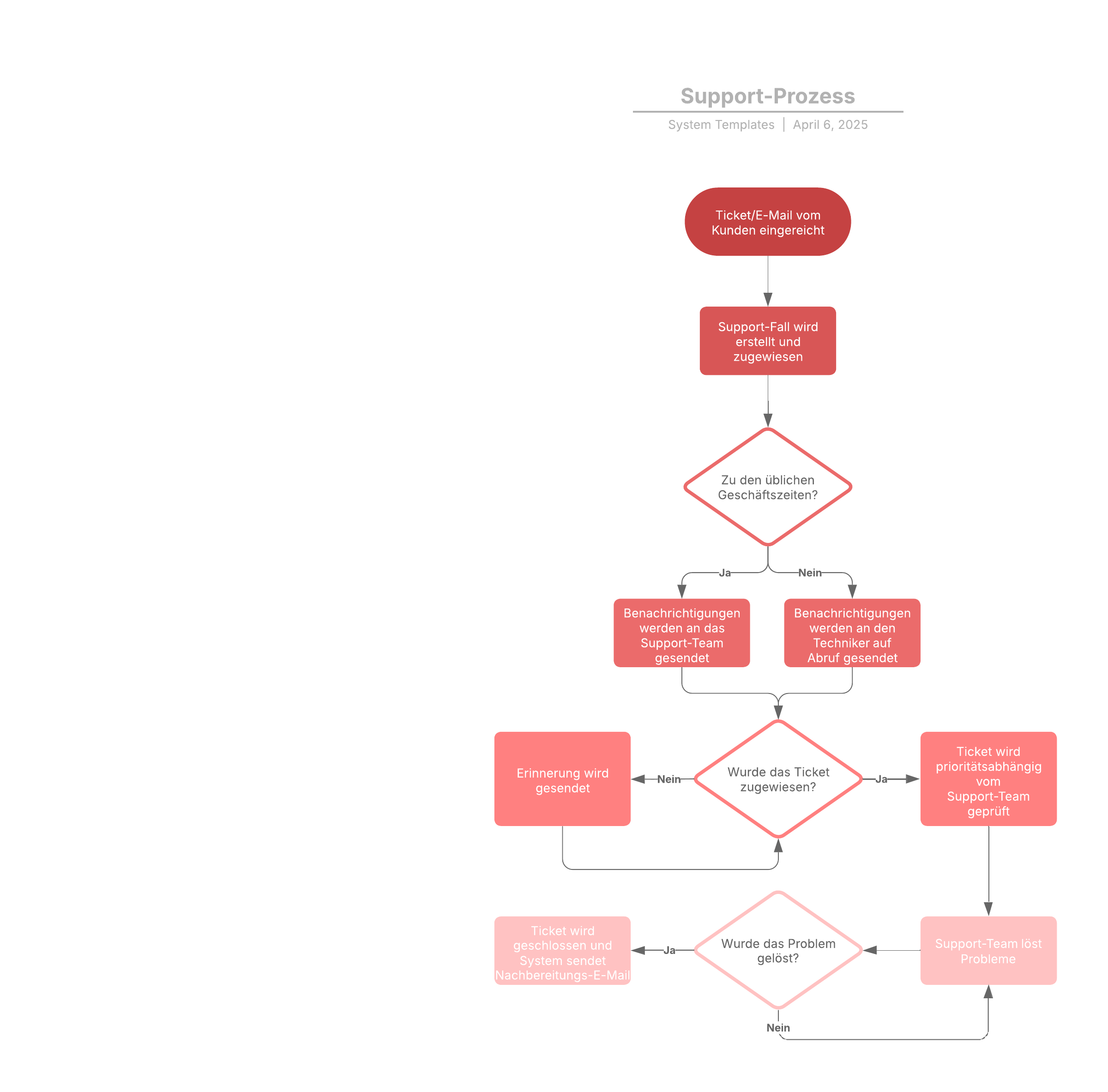 Dieses Flussdiagramm stellt den Support-Prozess für von Kunden eingereichte Tickets dar.