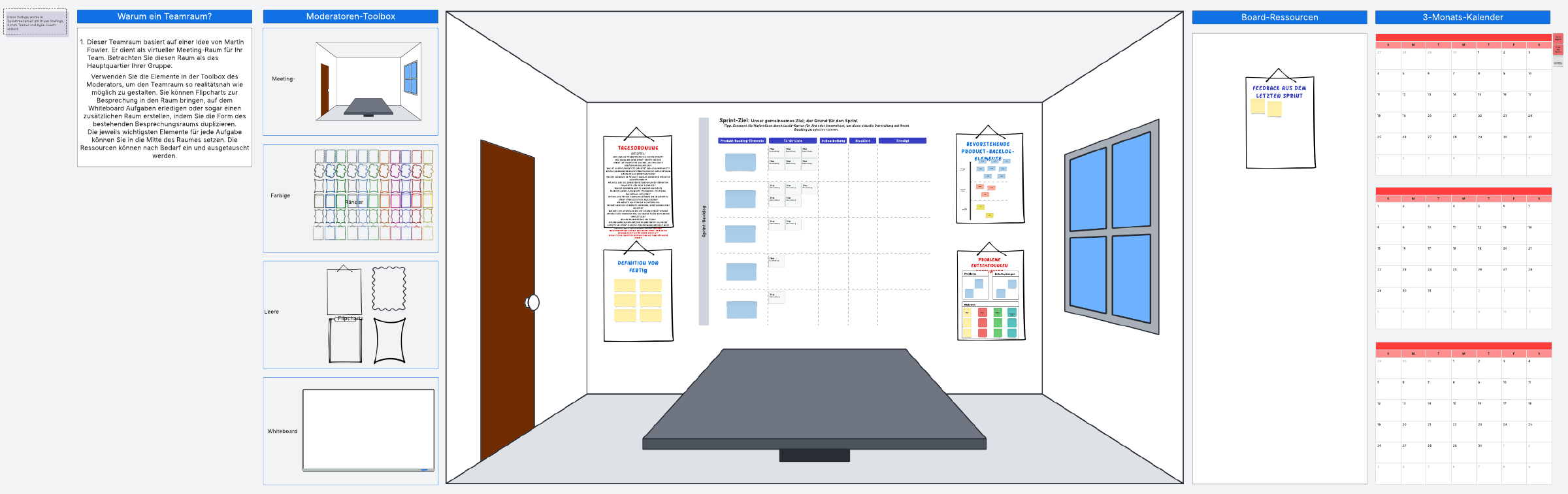 In der realen Welt würde sich Ihr Team in einem Büro oder Konferenzraum treffen, um ein Sprint Planungsmeeting abzuhalten. Die Vorlage befindet sich zwar nicht in einem echten Büro, aber sie hat viele Vorteile: