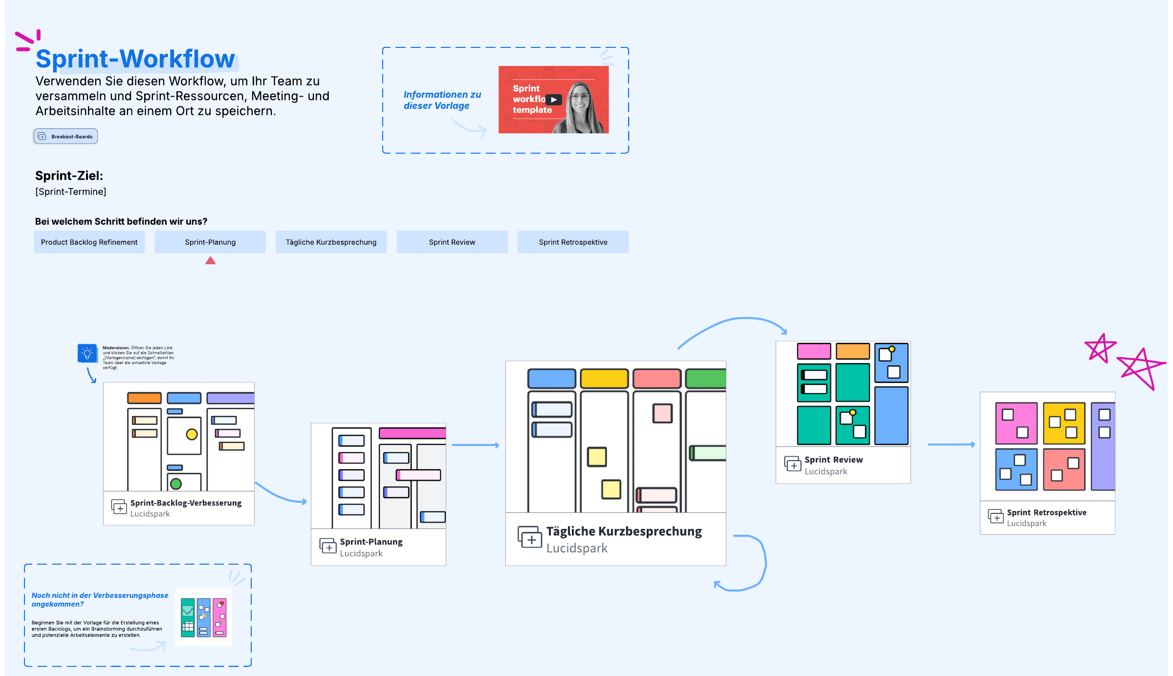 Mit dieser Vorlage können Sie alle agilen Ereignisse in Ihrem Sprint bequem an einem Ort unterbringen. Sie ist vorkonfiguriert und unterstützt die Verbesserung Ihres Produkt-Backlogs, Ihre Sprint-Schätzung, Sprint-Planung, täglichen Standups, Sprint-Überprüfung und Retrospektive in einem Board.