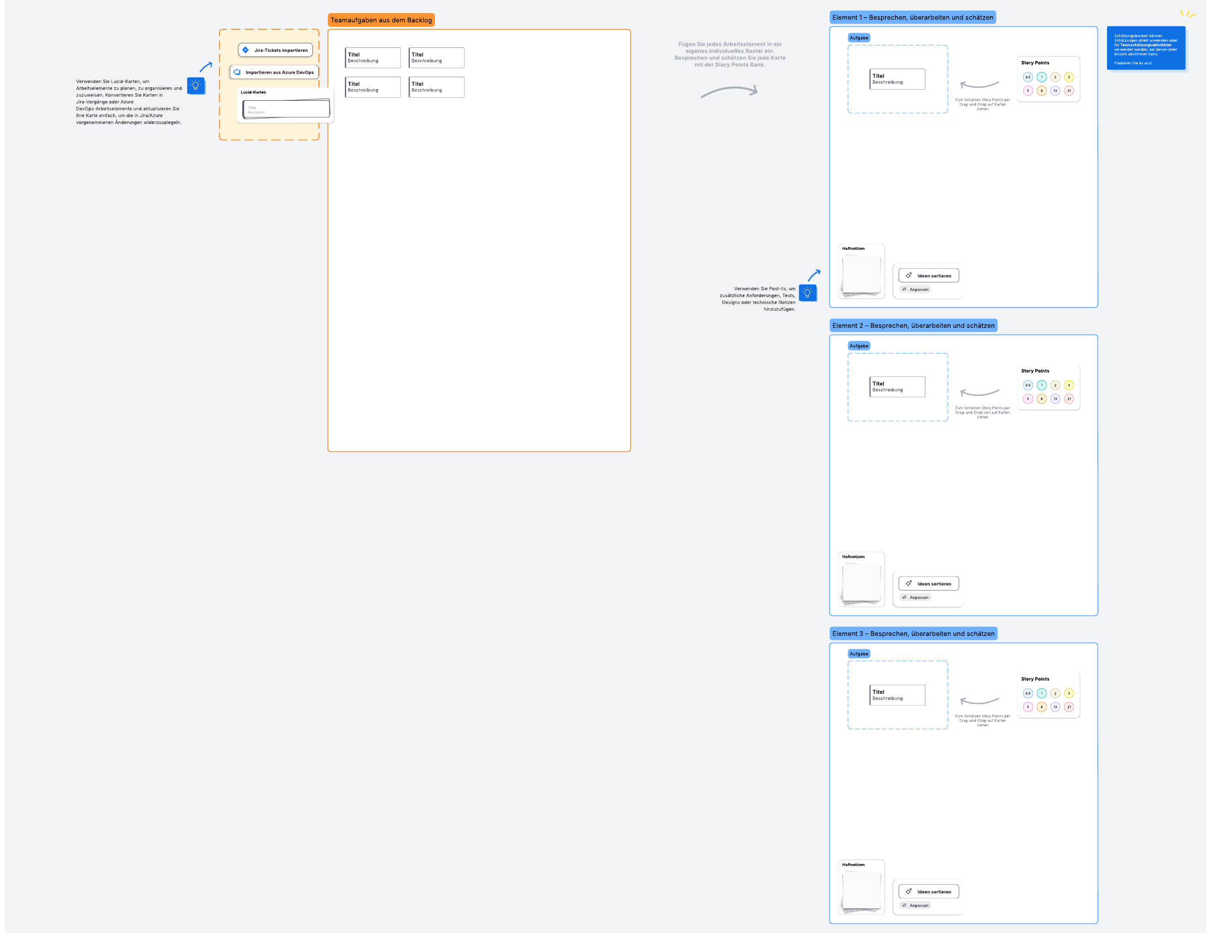 Bei der Sprint-Schätzung schätzen die Teams den Umfang oder die Komplexität einer Reihe von Aufgaben. Diese Vorlage verwendet die Fibonacci-Folge, die in vielen agilen Teams zur Schätzung von Aufgaben im Rahmen des Scrum-Prozesses verwendet wird.