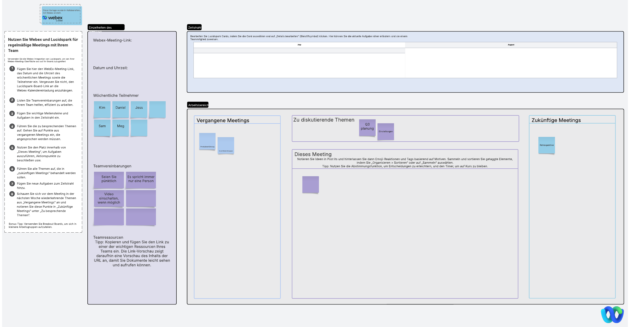 Treffen Sie sich regelmäßig mit Ihrem Team mithilfe der Webex-Integration von Lucidspark. Halten Sie Ihre Meetings in Webex ab und verwenden Sie die Vorlage für Team-Meetingräume, um zu zeigen, worum es gehen soll.